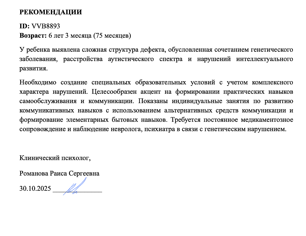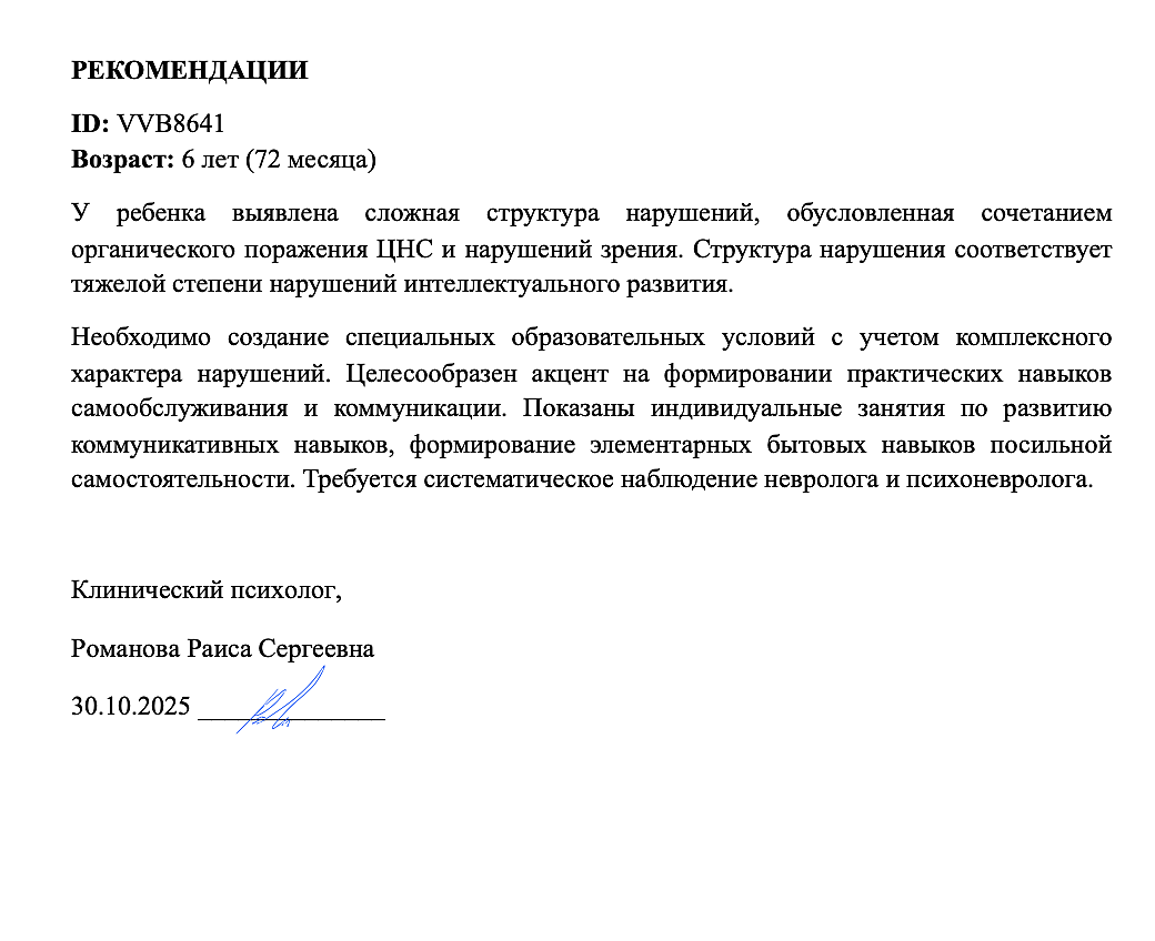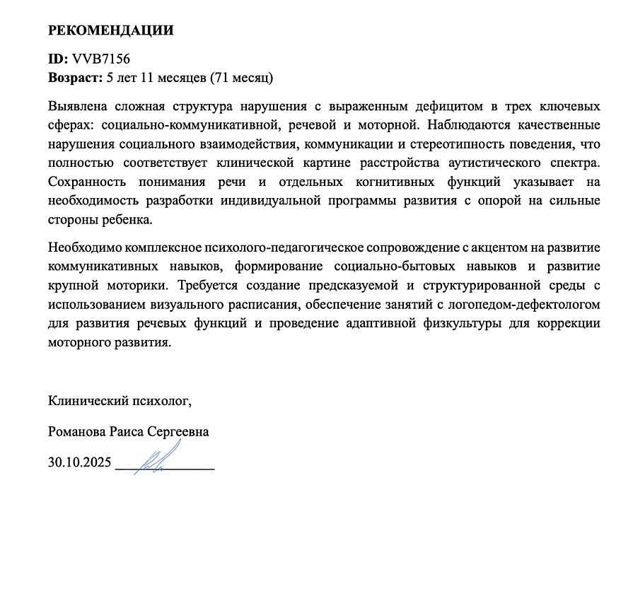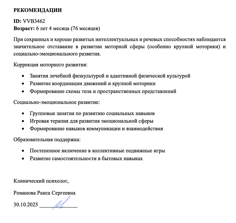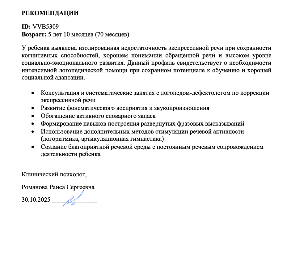 На основе результатов тестирования для всех участников проекта были составлены заключения, в которых были описаны сильные и слабые стороны, а также подготовлены индивидуальные рекомендации. С ними были ознакомлены как родители, так и специалисты.