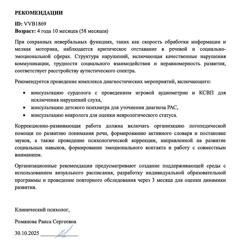 - Основное тестирование: протоколы обследования «Когнитивная батарея», «Крупная моторика», «Экспрессивная речь», а также шкалы «Социально-эмоциональная сфера: шкала развития» и «Самообслуживание/адаптация».