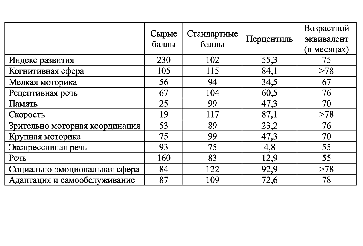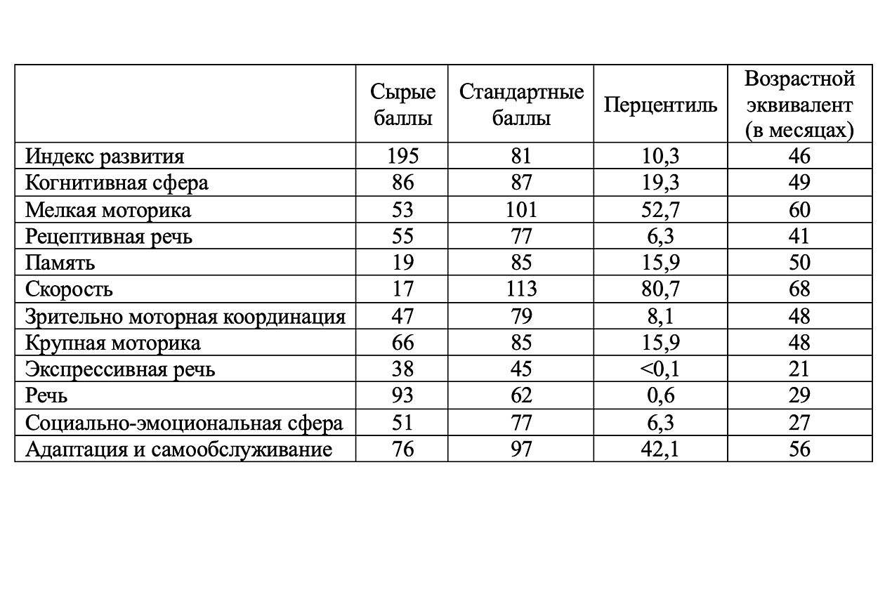 - Индекс развития — объединенный показатель, включающий когнитивную сферу, мелкую моторику, рецептивную речь, память и скорость. Помогает принять решение о необходимости включения ребенка в специализированные образовательные программы.