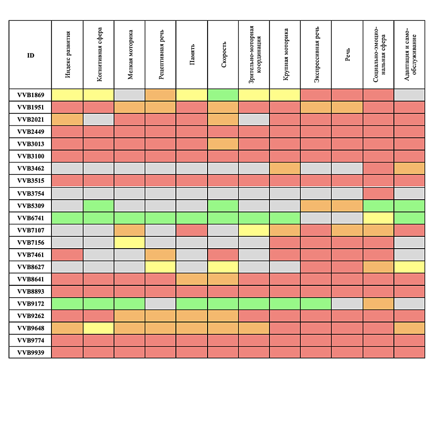- В отдельных, наиболее сложных случаях с редкими генетическими нарушениями, поражениями центральной нервной системы или серьезными черепно-мозговыми травмами наблюдается значительное снижение показателей во всех сферах (VVB2449, VVB8641, VVB9939).