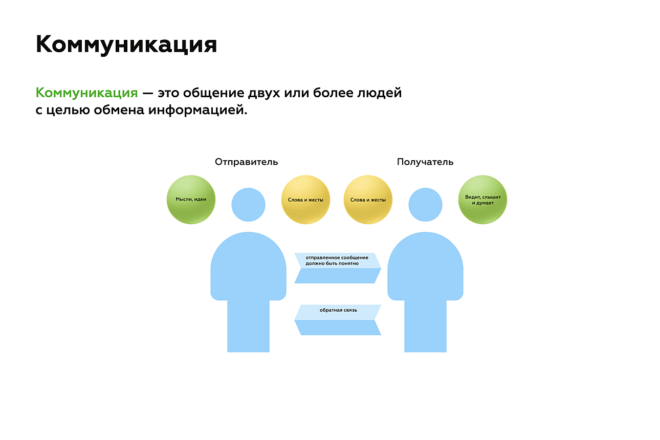 Говоря «коммуникация», мы обычно подразумеваем общение двух или более людей, обладающих какой-либо информацией, которые делятся ею друг с другом. В какой-то момент общения каждый из участников становится то отправителем, то получателем информации, т. е. это не статичный и не односторонний процесс. Отправитель формулирует сообщение и делится им с получателем, при этом он должен учитывать особенности восприятия получателя, убедиться, что выбранный способ донесения информации сработает и получатель все поймет, а также будет в состоянии отреагировать на сообщение.