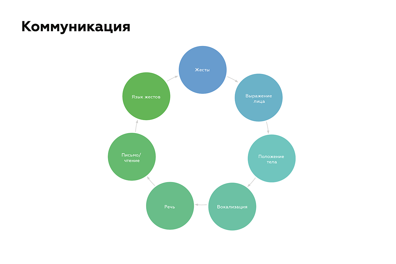 Когда мы говорим о процессе коммуникации, то, как правило, имеем в виду звучащую речь. Конечно, это самый распространенный способ коммуникации, что тут говорить! Но если вы вспомните, как именно вы общаетесь с людьми, то поймете, что в общении вы используете массу разных жестов: двигаете руками, указываете на предметы, меняете мимику лица, можете подойти поближе или отойти подальше. Вы также используете средства речевой выразительности: паузы, вздохи, цоканье языком и т. д. Мы иногда забываем, что все эти средства тоже имеют определенный смысл, и каждый из вас может сказать, какой смысл мы обычно вкладываем, когда их используем. Например, мотание головой влево-вправо усиливает (а может и заменить) наше «нет», кивание головой вверх-вниз делает то же самое в случае с «да». Ученые придерживаются мнения, что 70–80% основной информации мы получаем, анализируя именно жестовую коммуникацию вместе со словами.