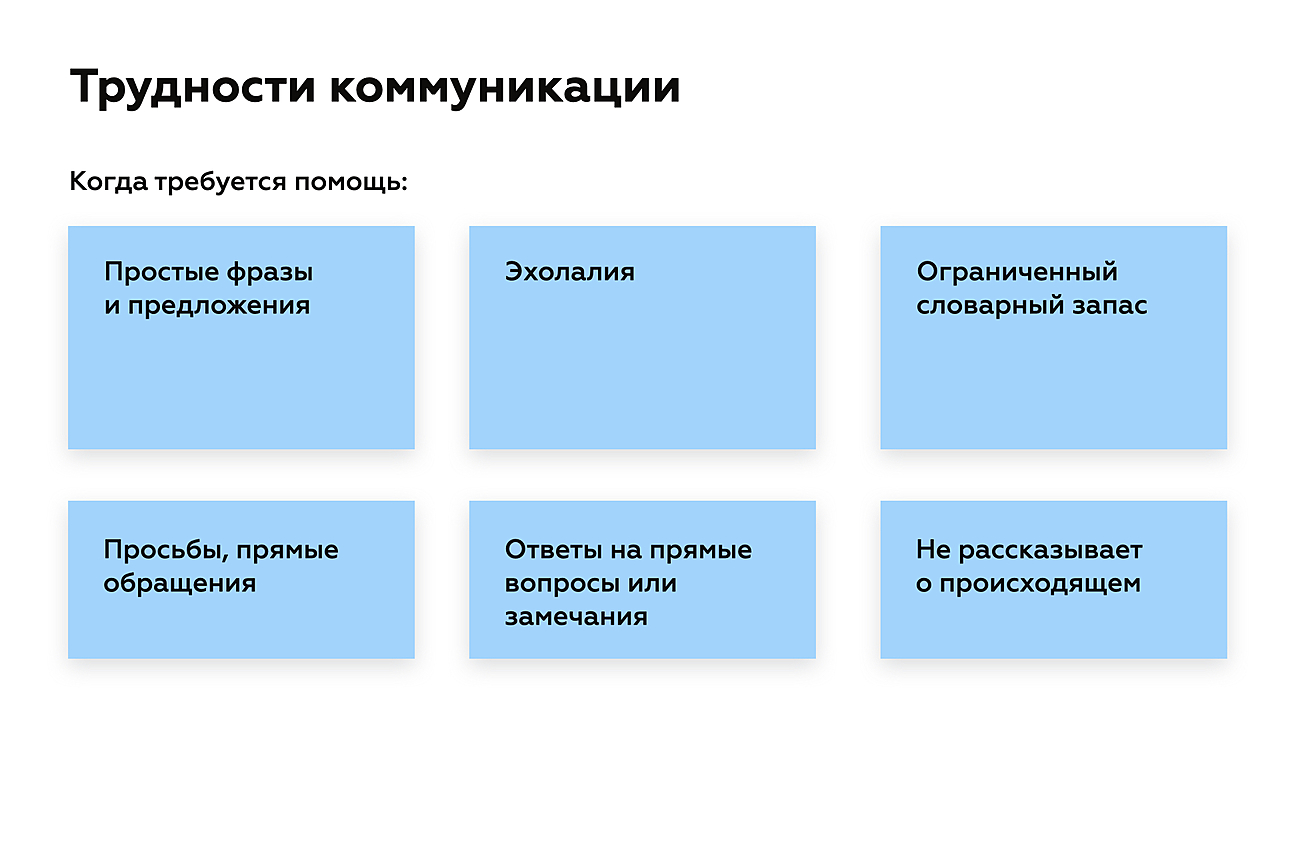 Повод подумать, что ребенку, возможно, нужна помощь, — ограниченный словарный запас или словарный запас, основанный исключительно на предпочтениях и интересах ребенка. Если ребенок может обратиться к кому-то или попросить о чем-то, но он не делится информацией, эмоциями, не взаимодействует с людьми обычным образом. Ребенок в состоянии отвечать на прямые вопросы или простые просьбы взрослых, но он совершенно ничего не рассказывает о себе. Так, дети с РАС достаточно редко демонстрируют потребность поделиться впечатлениями от прошедшего дня, и нередко это касается не только детей с ограниченным словарным запасом. Бывают ситуации, когда ребенок может довольно развернуто описывать то, что он видит, отвечать на вопросы по прочитанному тексту, но при этом ему крайне тяжело рассказать, что он делал сегодня в школе, во что играл или куда ходил вместе с одноклассниками. Как правило, эти умения определяются как важные цели в обучении ребенка, и развитие навыка рассказа о себе чаще всего требует немало усилий со стороны педагогов и родителей.