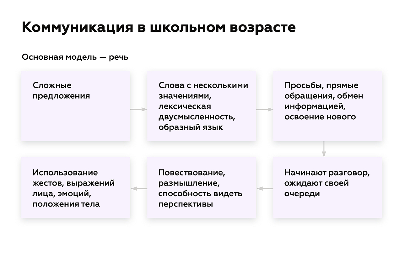 Совершенствование языковых навыков для детей школьного возраста оказывается невероятно важным в процессе обучения и получения знаний, поскольку эти два аспекта взаимосвязаны. Развиваются возможности диалога, способность предвосхищать смену ролей, инициировать общение. Помимо этого, происходят значительные изменения в социальном взаимодействии: дети учатся общаться с бóльшим количеством людей и познавать особенности такого многокомпонентного речевого взаимодействия. На какие темы я могу поговорить со своими сверстниками в классе? О чем болтать перед уроком физкультуры? А какие разговоры можно вести на уроке истории в присутствии учителя? Это примеры нюансов, которые могут возникать в процессе общения, и в младшем школьном возрасте типично развивающийся человек уже понимает, о чем можно, а о чем не стоит говорить в определенной ситуации. Для детей с аутизмом эти общепринятые правила абсолютно не очевидны, и ребенок с РАС может вызывать смех или недоумение у сверстников, когда пытается инициировать или поддержать разговор.