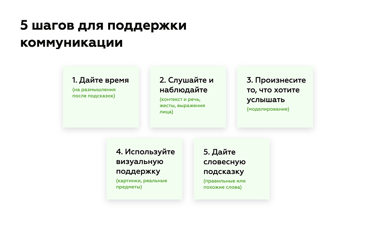 Итак, что мы можем сделать для того, чтобы научиться принимать такое общение, обучать ребенка или предлагать какие-то образцы речевого поведения? Вот пять шагов, которые, по нашему мнению, очень важны и подходят для всех.