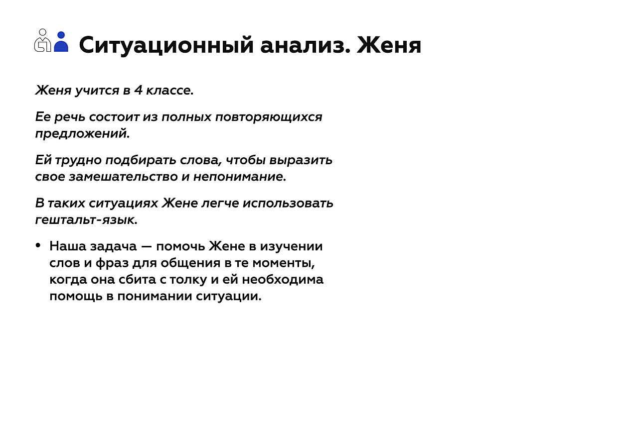 У Жени аутизм, она учится в 4 классе, и ее речь состоит из полных повторяющихся предложений. Женя умеет читать и может ответить на простые вопросы. Например, после прочтения рассказа учитель спрашивает: «Куда пошел Шурик?» Она правильно отвечает: «Шурик пошел в парк». Тем не менее ей трудно подбирать слова, чтобы выразить свое замешательство или непонимание. В таких ситуациях Жене легче использовать гештальт-язык, т. е. она лучше запоминает более объемные конструкции, нежели отдельные слова. Имея трудности со следованием расписанию в течение дня, Женя беспокоится и начинает задавать шаблонные вопросы, например: «Когда обед? У меня сегодня будут занятия с логопедом? Можно я отдохну? Когда придет Ирина Ивановна?» Девочка произносит эти фразы без всякой связи с тем, что в данный момент происходит. Таким образом, в те моменты, когда она не может подобрать нужные слова, Женя использует готовые повторяющиеся фразы, которые ей давно и хорошо известны.