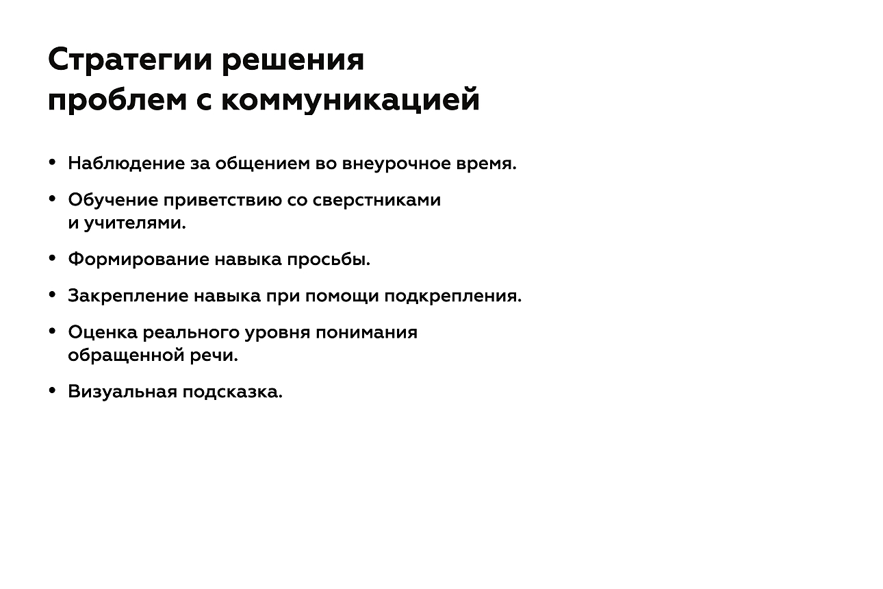 Необходимо помнить: помощь ребенку с аутизмом всегда индивидуализирована, обусловлена его текущими навыками и дефицитами. Первой целью всегда является формирование навыка просьбы, научение ребенка сообщать о своих потребностях. Оценивается пассивный и активный словарный запас ученика, на основе проведенного анализа ставятся цели — от простой просьбы одним словом до развернутых сообщений, помогающих ребенку в сложных для него ситуациях. Например, от просьбы одним словом «Помоги» до фразы «Я не понимаю, как решить эту задачу, помогите, пожалуйста». Точно так же ставятся цели по развитию коммуникативных навыков и в различных социальных и бытовых ситуациях.