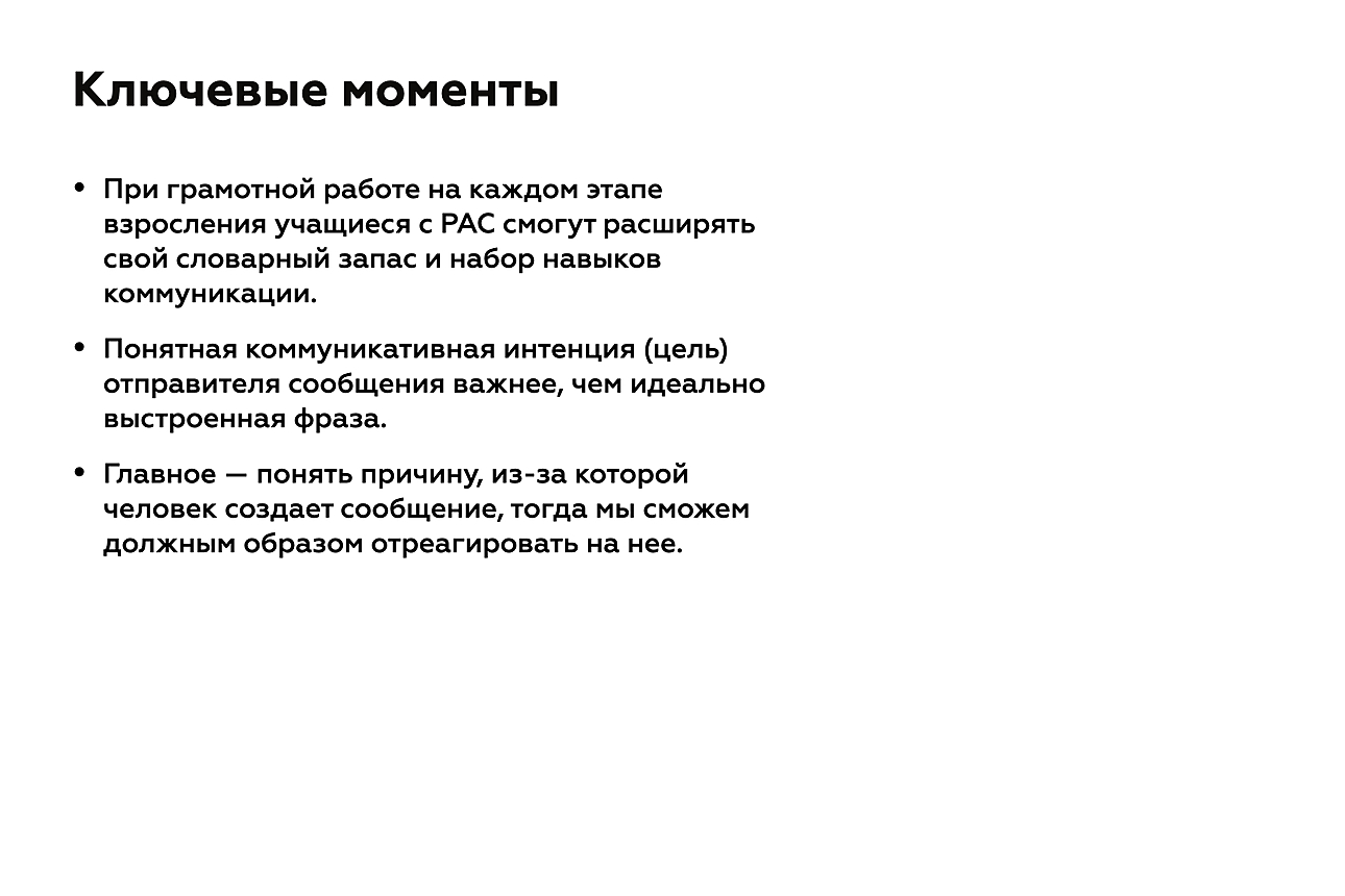 - При грамотной поэтапной работе над коммуникацией на каждом этапе взросления учащиеся с РАС смогут расширить свой словарный запас и расширить набор навыков коммуникации. Возможно, что наши ученики с РАС даже будут в состоянии вести переговоры и убеждать кого-то в чем-то, а также иметь близкие отношения с другими людьми.