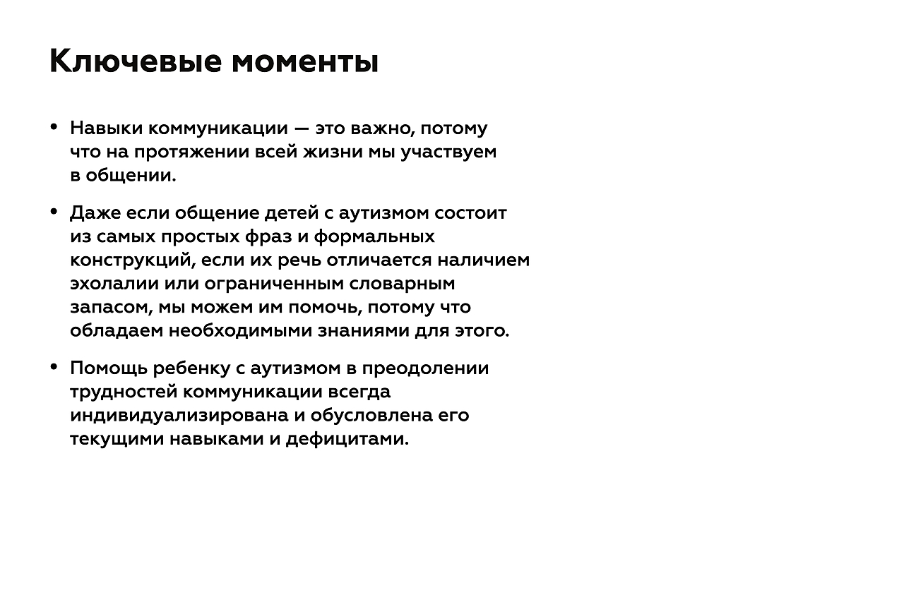 - Помощь ребенку с аутизмом в преодолении трудностей коммуникации всегда индивидуализирована и обусловлена его текущими навыками и дефицитами.
