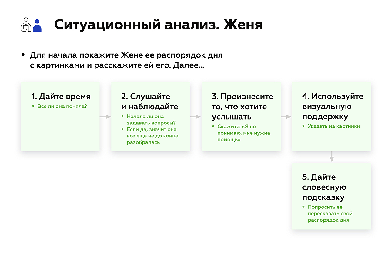 Вот как мы решили помочь нашей Жене. Мы показывали ей распорядок дня с картинками, чтобы убедиться, что ее вопросы не вызваны тревогой о том, что ее ждет, рассказывали план действий и вместе подробно разбирали его. Потом возвращались к заданию и пытались разобраться, что именно Женя не понимает, т. е. мы давали ей время, слушали и наблюдали, а затем предлагали подходящую фразу («Я не понимаю, мне нужна помощь») и снова повторяли все с самого начала. В идеале Женя повторяла фразу за нами (иногда так случалось), но, если нет, мы давали ей визуальную подсказку: показывали картинки, а она указывала на нужную, или карточки с написанными фразами, где она выбирала фразу «Я не понимаю, мне нужна помощь», а в некоторых случаях Женя получала от нас устную подсказку.