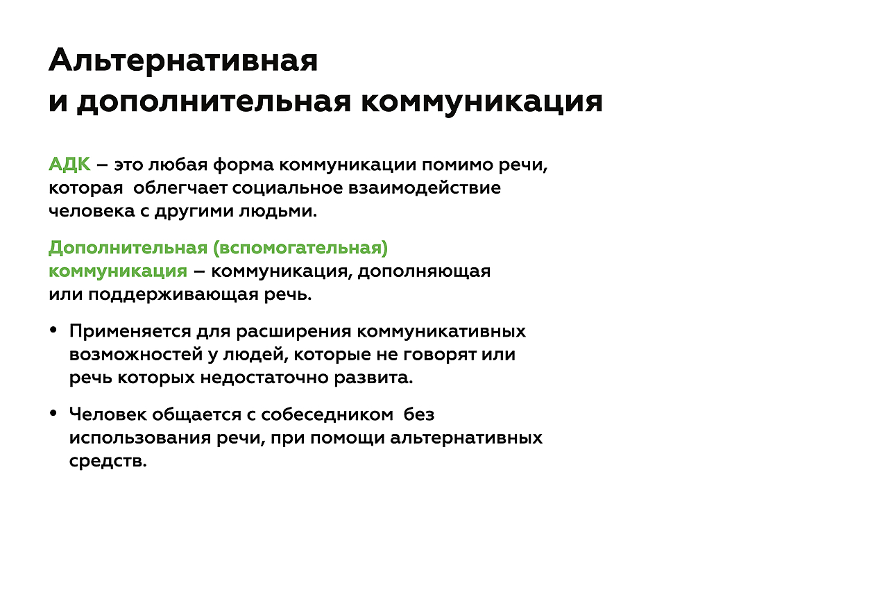 Альтернативная и дополнительная коммуникация (АДК)1 — это любая форма коммуникации помимо речи. Альтернативная и дополнительная коммуникация облегчает социальное взаимодействие человека с другими людьми и применяется для расширения коммуникативных возможностей людей, которые не говорят или речь которых недостаточно развита.