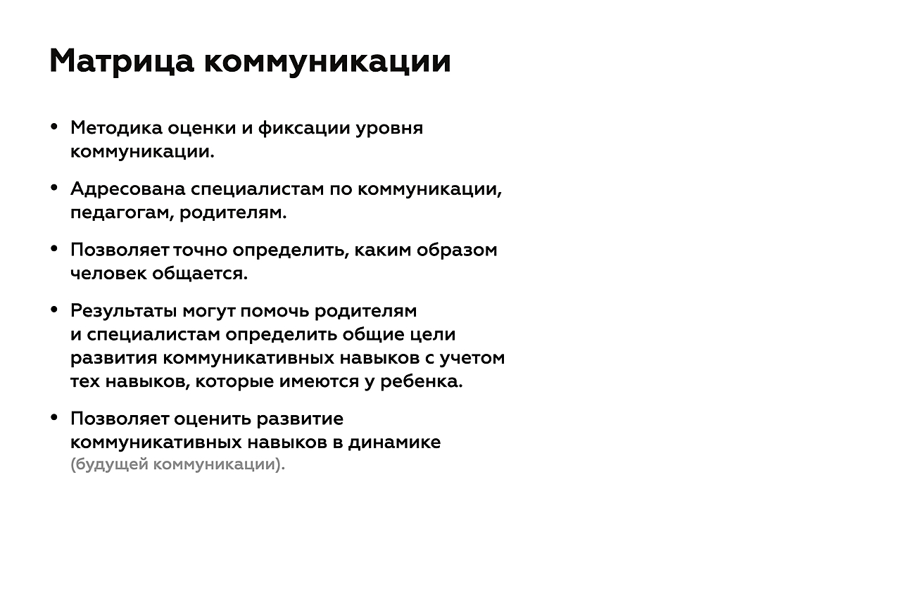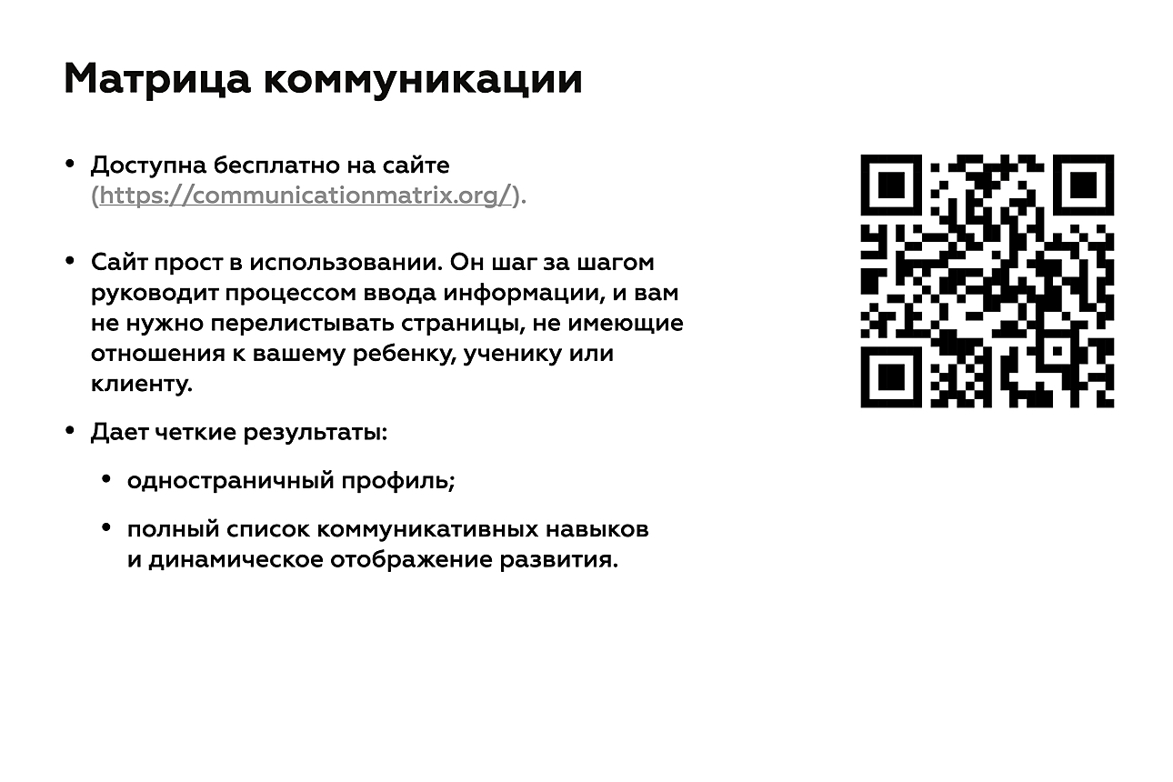 Матрица коммуникации охватывает четыре основных мотива общения (получить то, что нужно; отказаться от того, что не нужно; участвовать в социальном взаимодействии; предоставить или получить информацию). Матрица учитывает все виды коммуникативного поведения, в том числе альтернативные и дополнительные формы коммуникации (АДК) и досимвольную коммуникацию (жесты, мимику, взгляд и движения тела). Педагог или родитель может самостоятельно заполнить матрицу коммуникации (можно воспользоваться для этого бесплатным сайтом) и увидеть цели для улучшения коммуникации в зоне ближайшего развития.