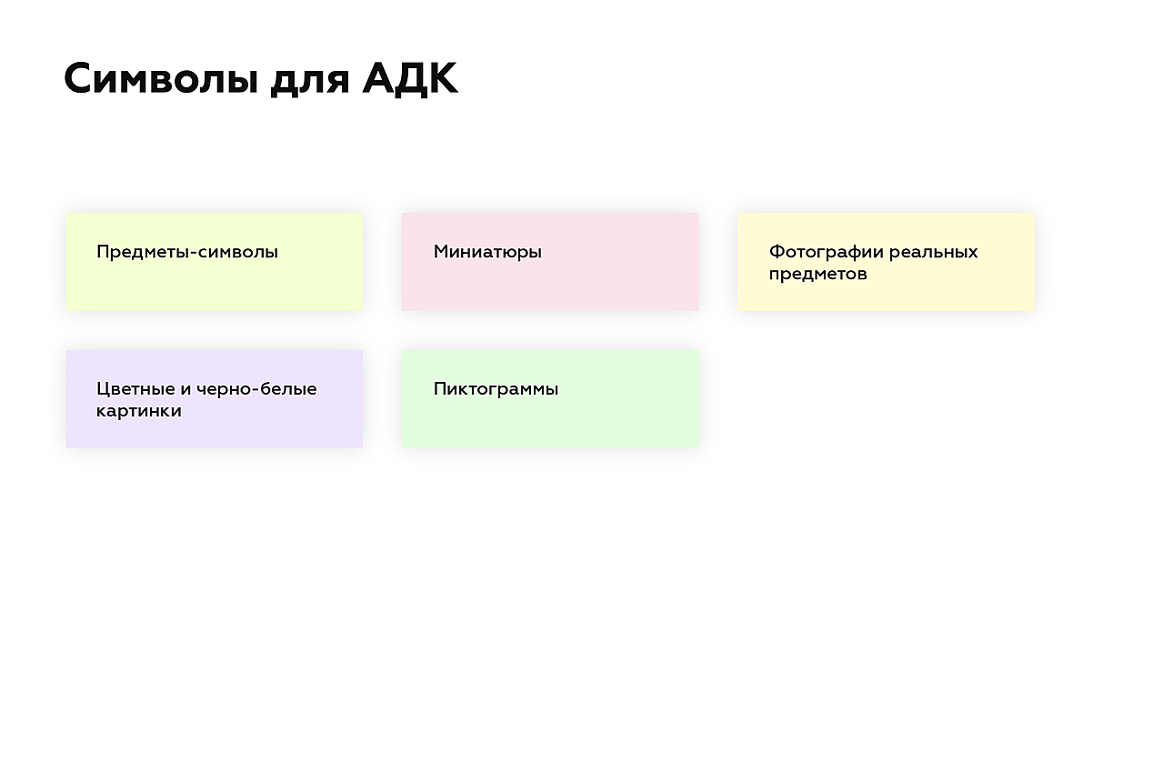 Определив текущий уровень коммуникации и ответив для себя на вопросы, где и с кем в течение дня общается ученик, какие способы коммуникации ему доступны, команда, работающая с учеником, приступает к созданию индивидуальной системы АДК.
