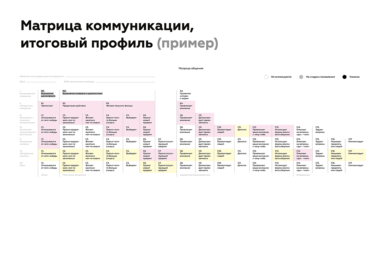Матрица коммуникации была разработана доктором Ч. Роуленд из Орегонского университета здоровья и науки, и впервые опубликована в 1990-м году. Это методика оценки и фиксации уровня коммуникации, которая позволяет точно определить, каким образом человек общается, а также получить общую схему определения целей дальнейшего развития коммуникативных навыков6.