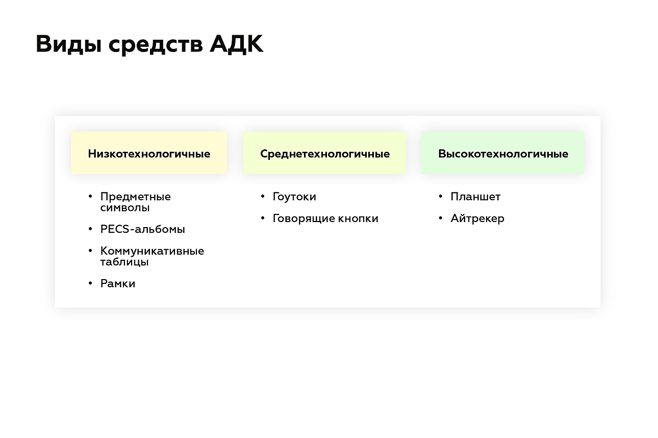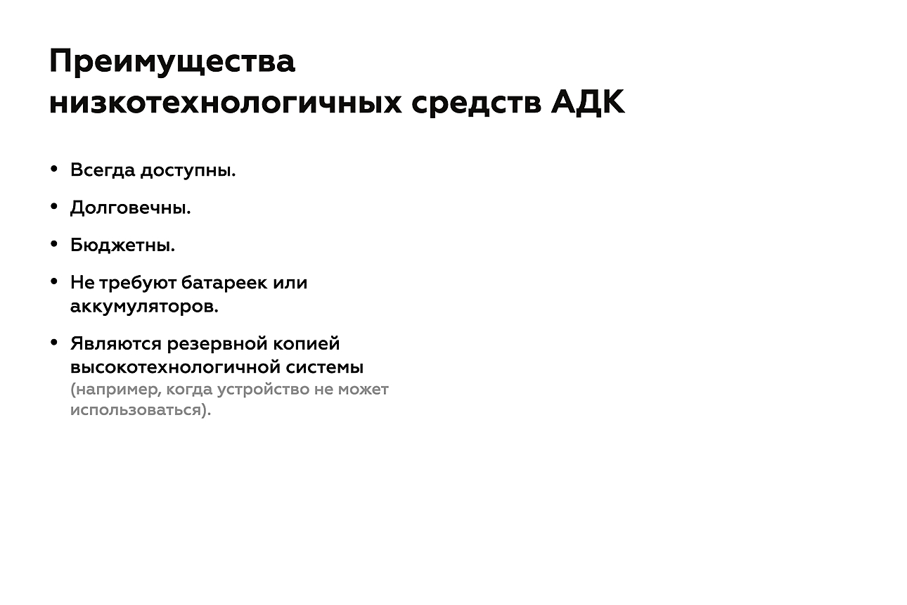 Нам важно понимать, что система АДК — это не само устройство, с помощью которого человек общается. Планшет или коммуникатор могут быть одним из инструментов общения при АДК, однако сама по себе альтернативная коммуникация не является устройством. Альтернативная и дополнительная коммуникация — это набор процедур и процессов, которые мы используем для достижения учеником наилучших результатов в функциональной и эффективной коммуникации. Во время работы с учащимися наш вопрос должен быть не о том, какое устройство для общения они используют, а о том, что представляет собой разработанная для ученика система альтернативной дополнительной коммуникации.