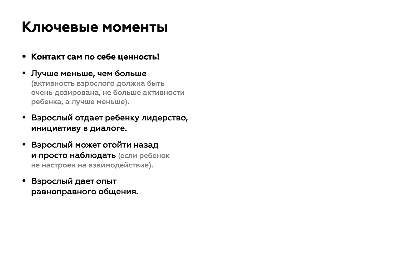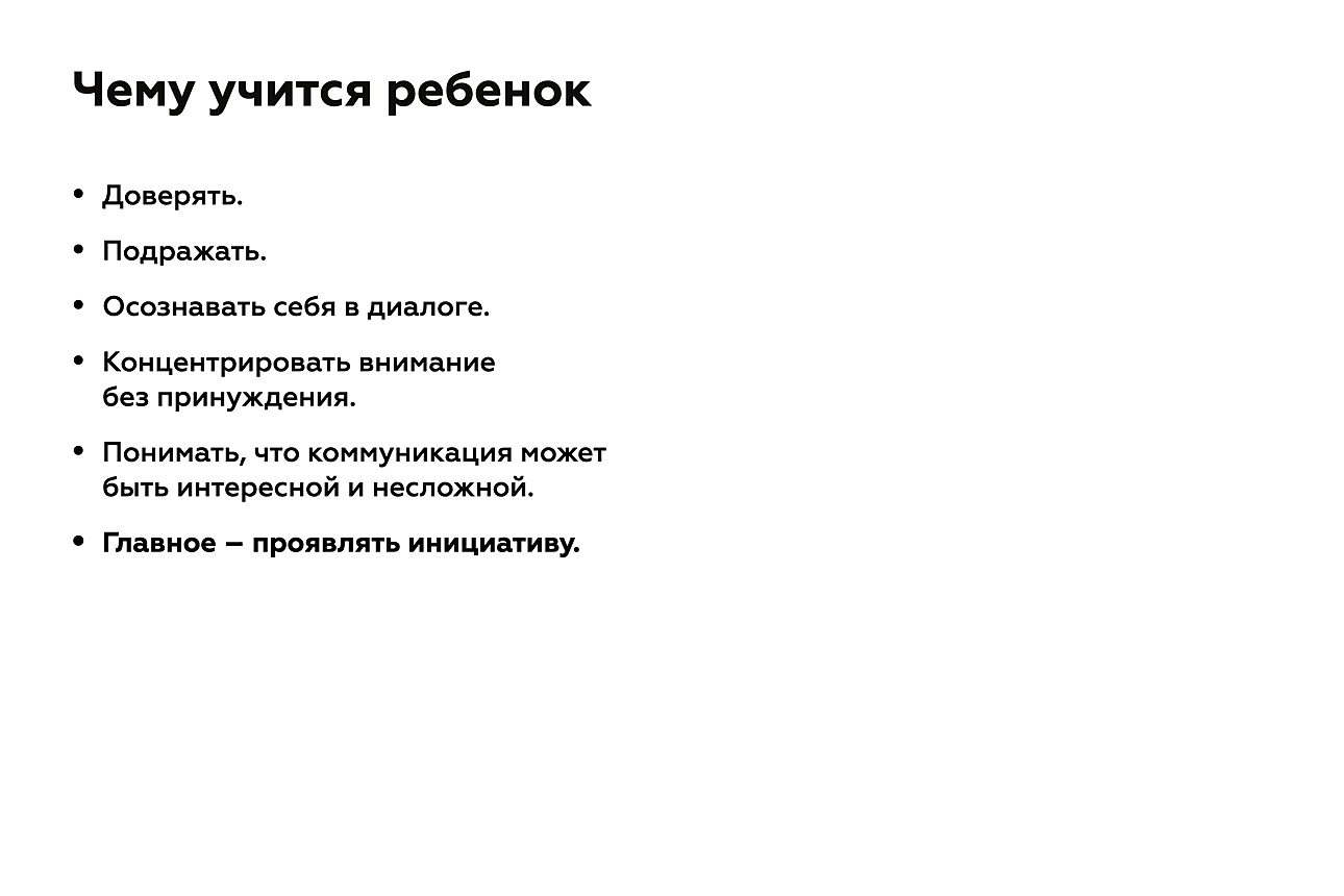 Важно также помнить, что общение между людьми не является статичным. Каждое наше взаимодействие состоит из четырех компонентов: приветствие, беседа на отвлеченные темы, «история» и прощание. В начале взаимодействия присутствует какая-либо форма приветствия, будь то постукивание по плечу или слово «Привет!». Мы всегда как-то даем ребенку понять, что хотим с ним поговорить. В качестве «отвлеченной беседы» обычно выступает вопрос «Как дела?», мимолетный комментарий о том, что мы делаем в данный момент, или просто улыбка.