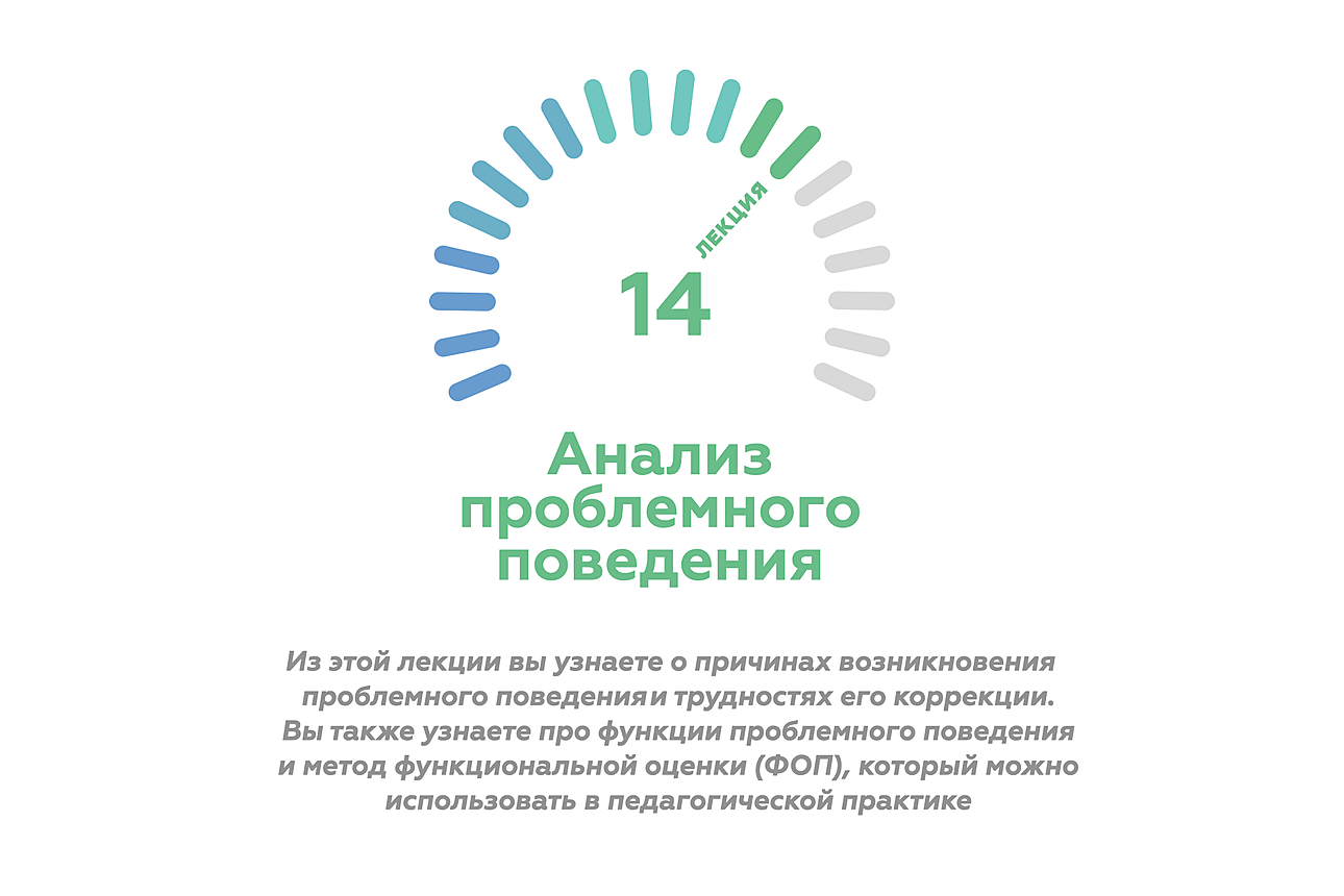 Эта лекция является центральной в курсе, который мы назвали «Поведенческая педагогика». Мы очень надеемся, что сведения, изложенные в лекциях этого курса, помогут вам иначе посмотреть на проблемное (нежелательное) поведение ваших учеников с аутизмом и любых других учеников, ведь нежелательное поведение время от времени демонстрирует каждый ребенок. Мы очень хотели бы, чтобы информация, которую вы получаете в ходе лекций, помогала в вашей практической работе, но мы обязаны обратить ваше внимание на то, что работа с поведением — отдельная сфера, требующая специального обучения и длительной практики под руководством опытных коллег.