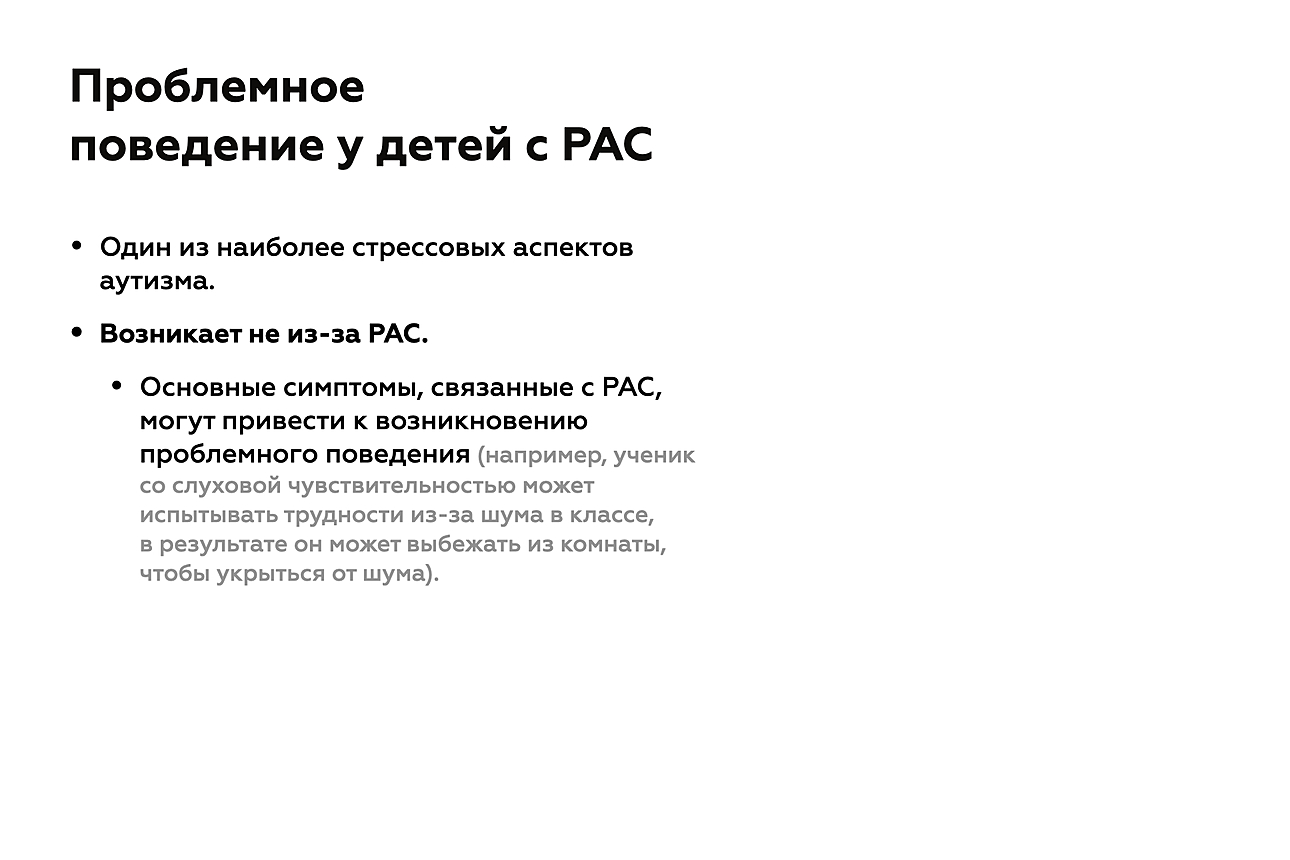 Коррекция проблемного поведения особенно важна для школьников с аутизмом, ведь в ряде случаев проблемное поведение может быть обусловлено некоторыми особенностями, характерными для детей с РАС, например изменением сенсорного восприятия или сложностями в коммуникации.