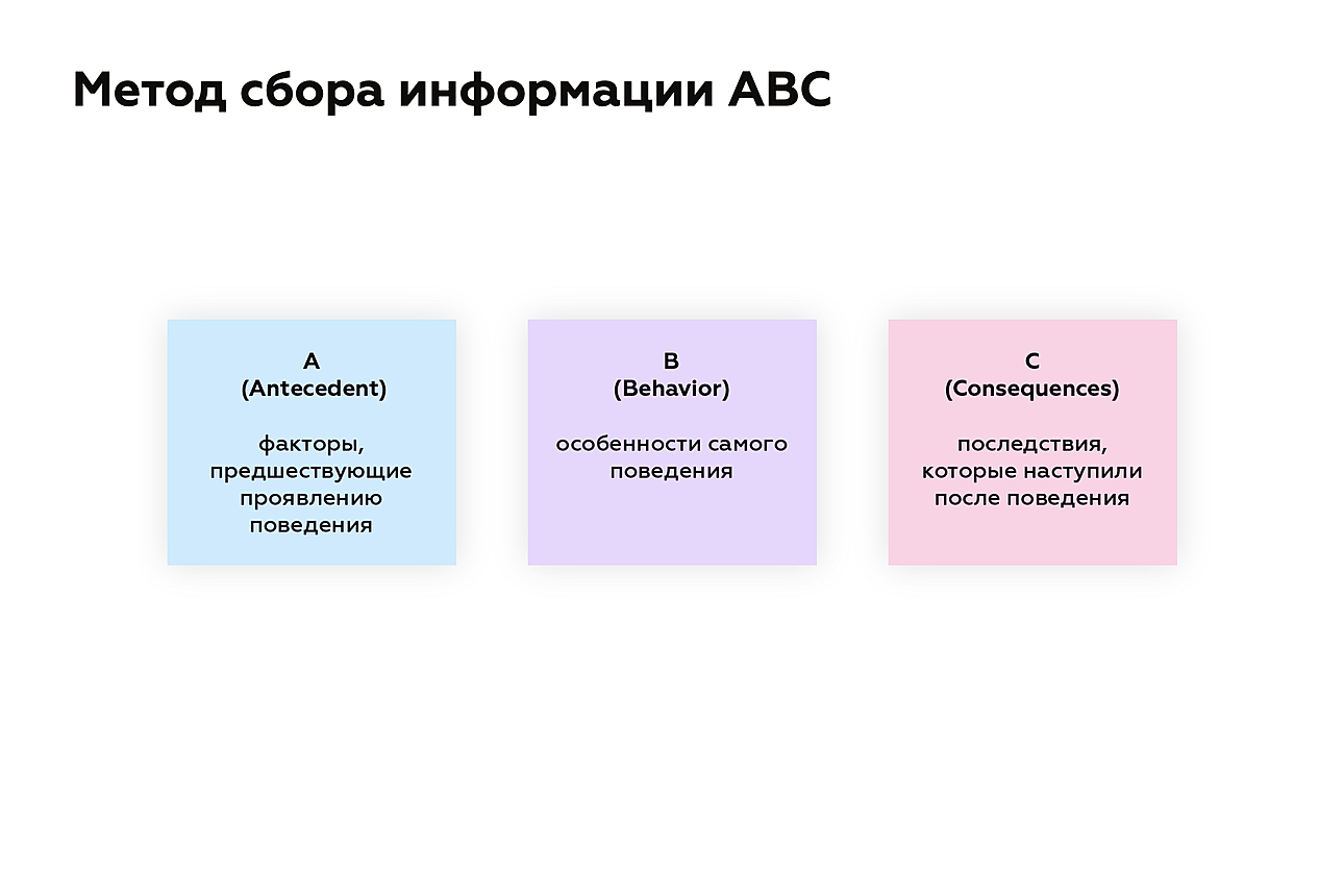 Второй метод сбора информации — прямой. Он предполагает, что мы непосредственно наблюдаем за ребенком, демонстрирующим проблемное поведение, и собираем данные именно в момент его проявления. В рамках анализа мы называем это сбором информации при помощи метода ABC, о котором мы поговорим позже. Это самый важный компонент анализа. По сути, мы даже не имеем права называть анализ ФОП, если в нем нет прямого сбора информации. Информации, полученной при помощи непрямого метода, никогда не бывает достаточно для качественной функциональной оценки.
