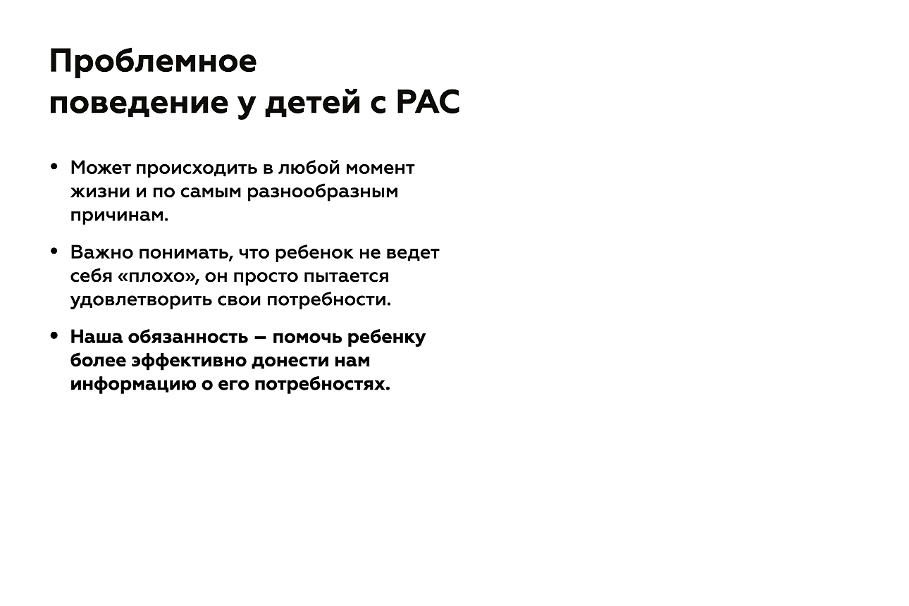 Важно помнить, что ребенок с аутизмом, проявляющий проблемное поведение, не ведет себя «плохо». Это оценочное суждение, которое часто мешает нам помочь ребенку и делает нас раздраженными. Между тем, скорее всего, такое поведение — попытка удовлетворить какую-то потребность. Чаще всего проблемное поведение — это способ общения, который доступен ученику с РАС, и оно обусловлено наличием или отсутствием у него тех или иных навыков. Наша задача — сперва понять, что ребенок пытается сообщить нам своим нежелательным поведением, а затем как можно быстрее помочь ему в удовлетворении его потребностей более адаптивным и функциональным способом.