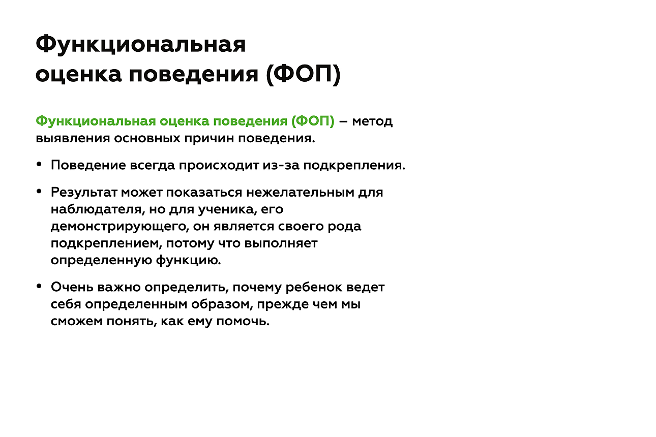 Функциональная оценка/анализ поведения (ФОП) — это метод выявления основных причин проблемного поведения, а также установления взаимосвязей между проблемным поведением и событиями, влияющими на него. Выявление таких причин и подкрепляющих последствий позволяет корректировать нежелательное поведение.