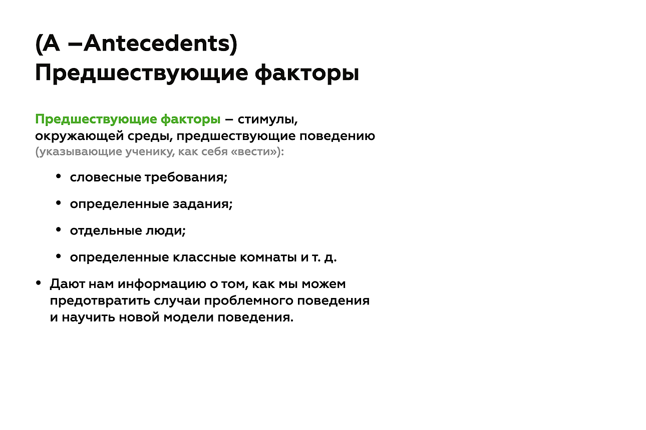 Выявление предшествующих факторов дает нам ценную информацию, так как знание того, что они собой представляют, позволяет решить проблему до ее возникновения, т. е., действуя на опережение, мы предотвращаем проблемное поведение и учим человека чему-то новому. Правильно определив предшествующие факторы, мы сможем понять, как нам научить ребенка новой модели поведения или удовлетворению потребностей другим приемлемым способом, что и является нашей главной целью.