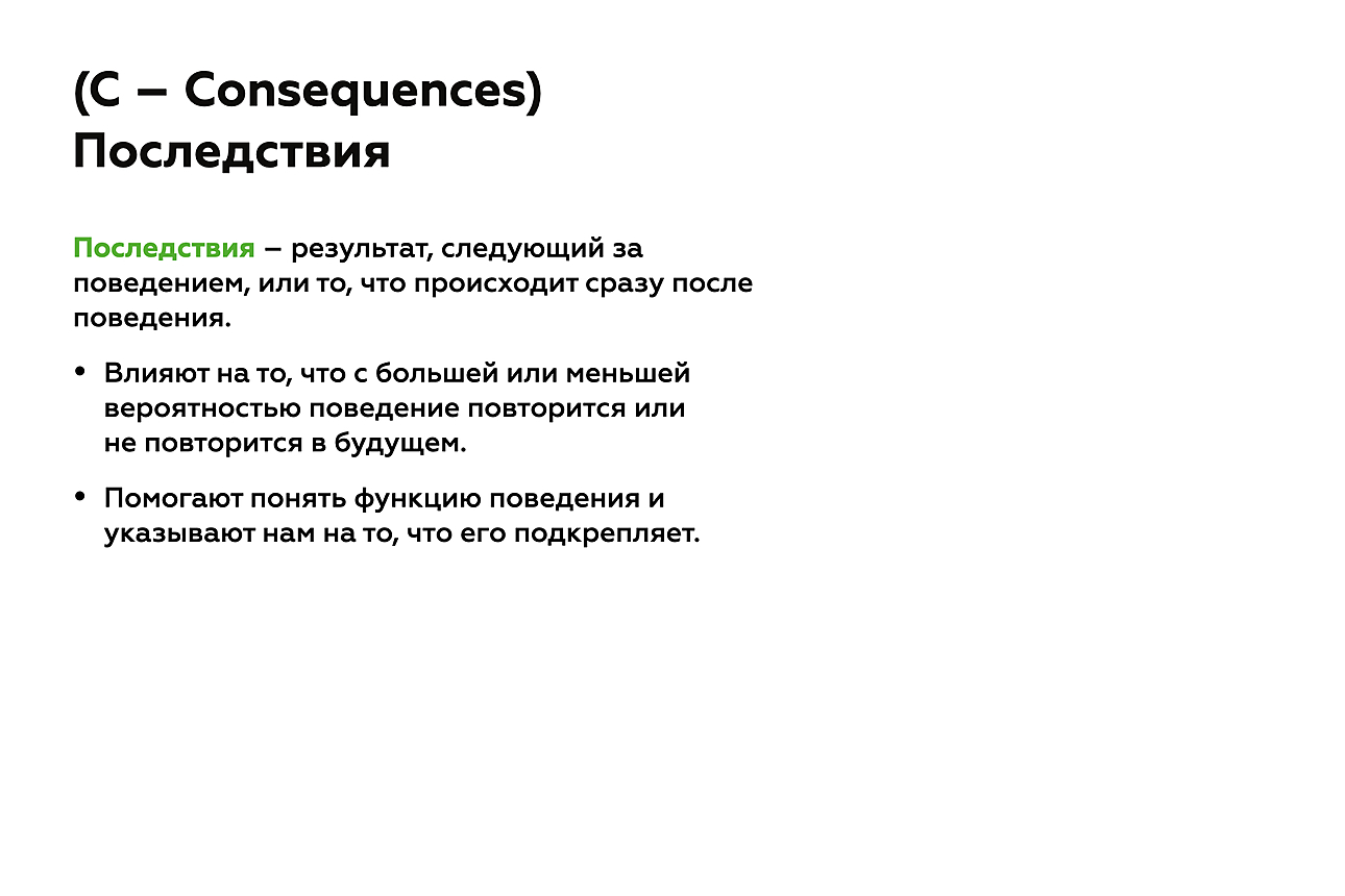- о последствиях, которые наступили в окружающей среде после поведения (C — Consequences).