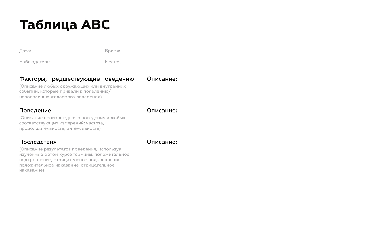 Для фиксации данных анализа удобно использовать таблицу АВС11. В соответствующем разделе под названием «предшествующие факторы» указываются события или стимулы, происходящие непосредственно перед возникновением определенной поведенческой реакции. Здесь важно описать событие конкретно, а не общими словами. Не просто «урок» или «получил задание», а какой конкретно урок, какое задание и какая была дана инструкция. Раздел «поведение» отражает уже саму реакцию. В разделе «последствия» указываются события действия, возникающие в результате определенного поведения. Поведение должно быть описано достаточно подробно, как и его последствия: что сделали окружающие ребенка люди и чем поведение завершилось.