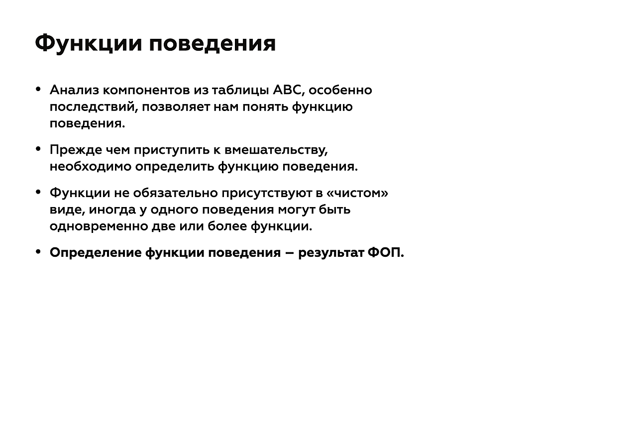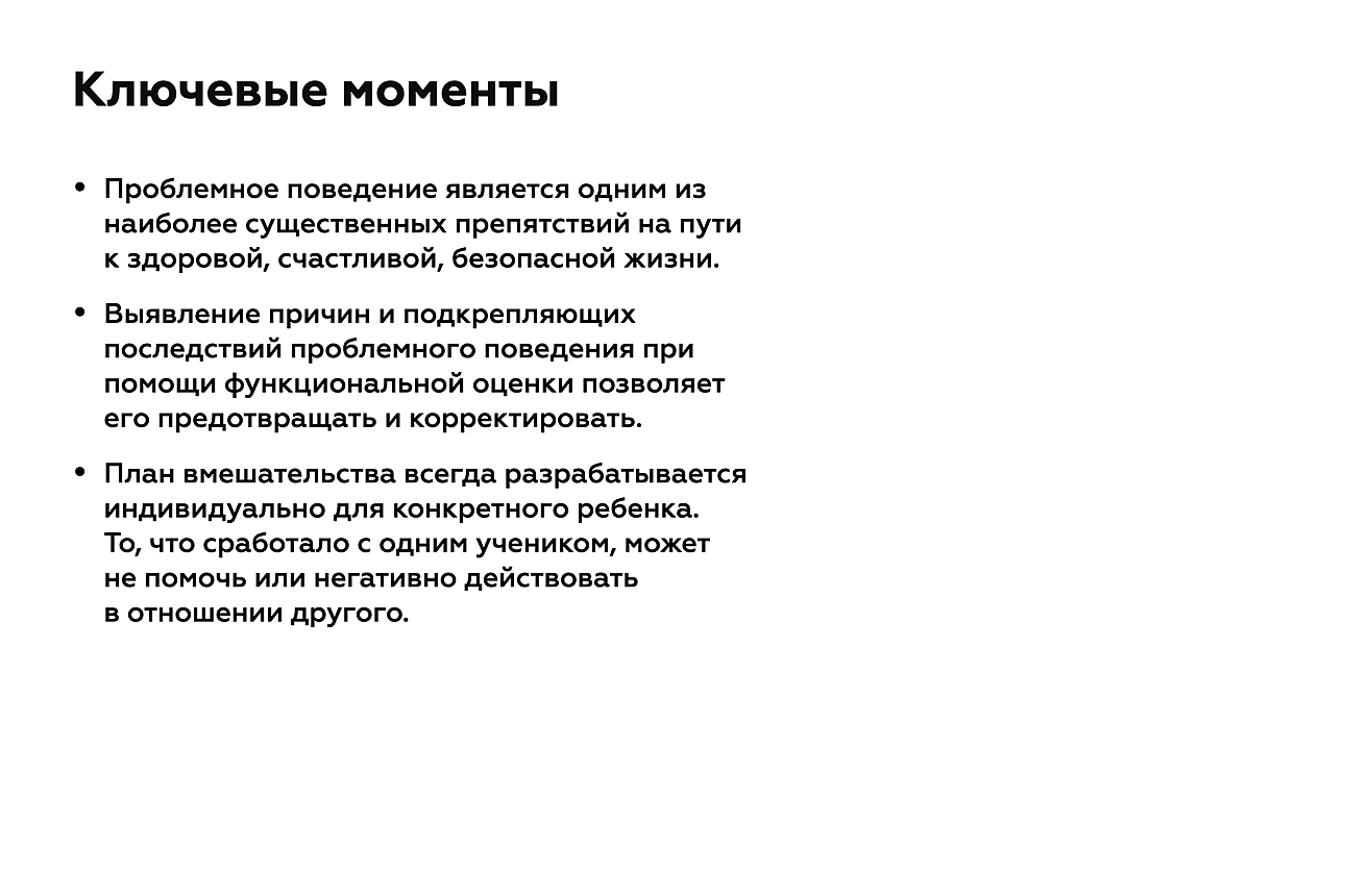 - Выявление причин и подкрепляющих последствий проблемного поведения при помощи функциональной оценки позволяет его предотвращать и корректировать.