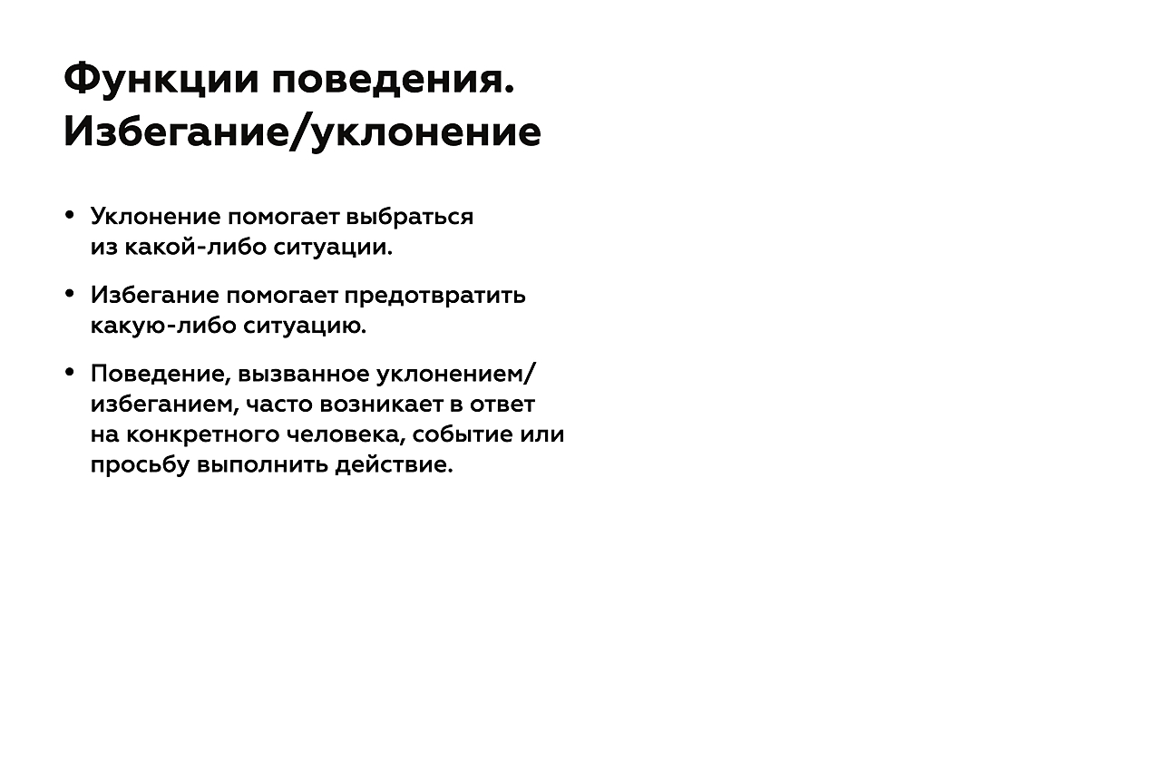 Следующая функция проблемного поведения — избегание нежелаемого или уклонение от требования. Избегание — это такое проявление поведения, которое помогает ребенку не попасть в определенную ситуацию, а уклонение — это уход от нежелательной для него ситуации.