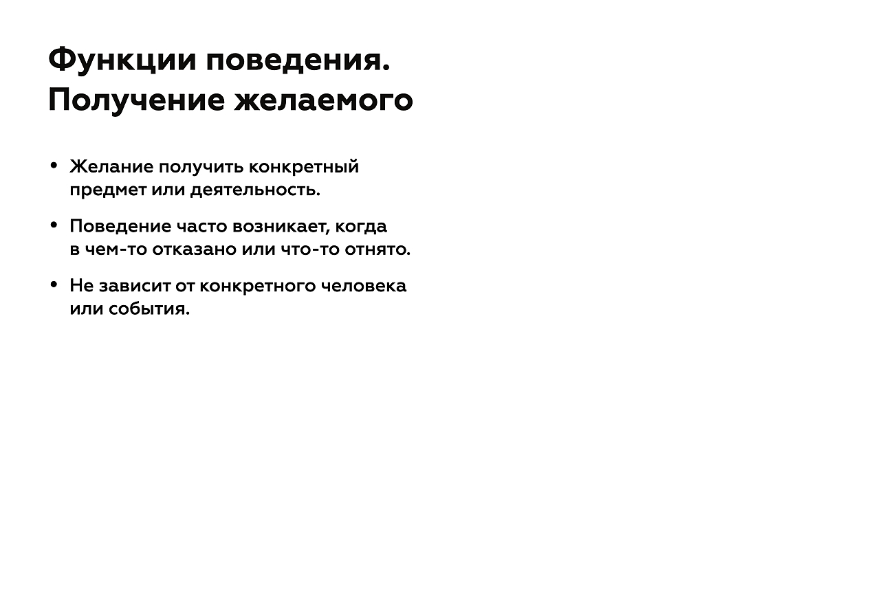 Таким образом, несмотря на ярко выраженную функцию доступа к желаемому во всех перечисленных примерах, направления работы с поведением будут выбраны исходя из тех или иных дефицитов у конкретного ребенка.