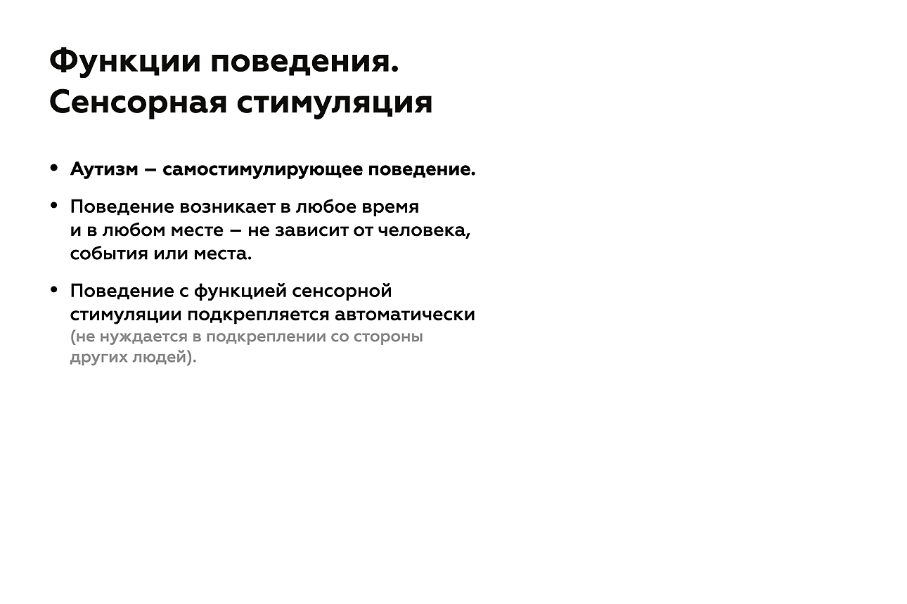 Мы знаем, что у людей с расстройствами аутистического спектра часто наблюдается самостимулирующее поведение, которое вызывается их потребностями. Посредством стимуляции такая потребность снижается. С поведением аутостимуляции сложно работать, т. к. оно подкрепляется автоматически, а значит, создание нами определенных последствий после этого поведения вряд ли существенно повлияет на его частоту.