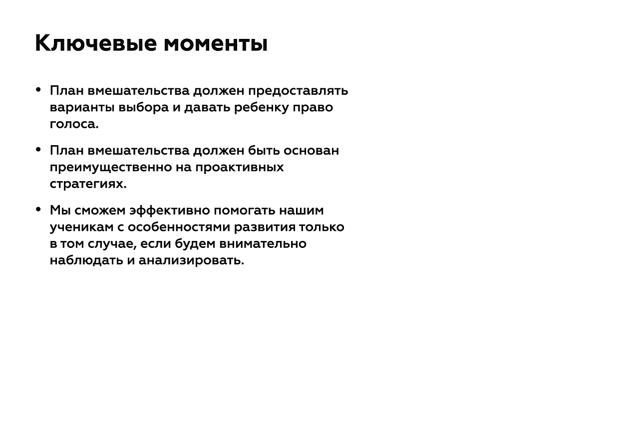 - План вмешательства всегда разрабатывается индивидуально для конкретного ребенка. То, что сработало с одним учеником, может не помочь или негативно действовать в отношении другого.