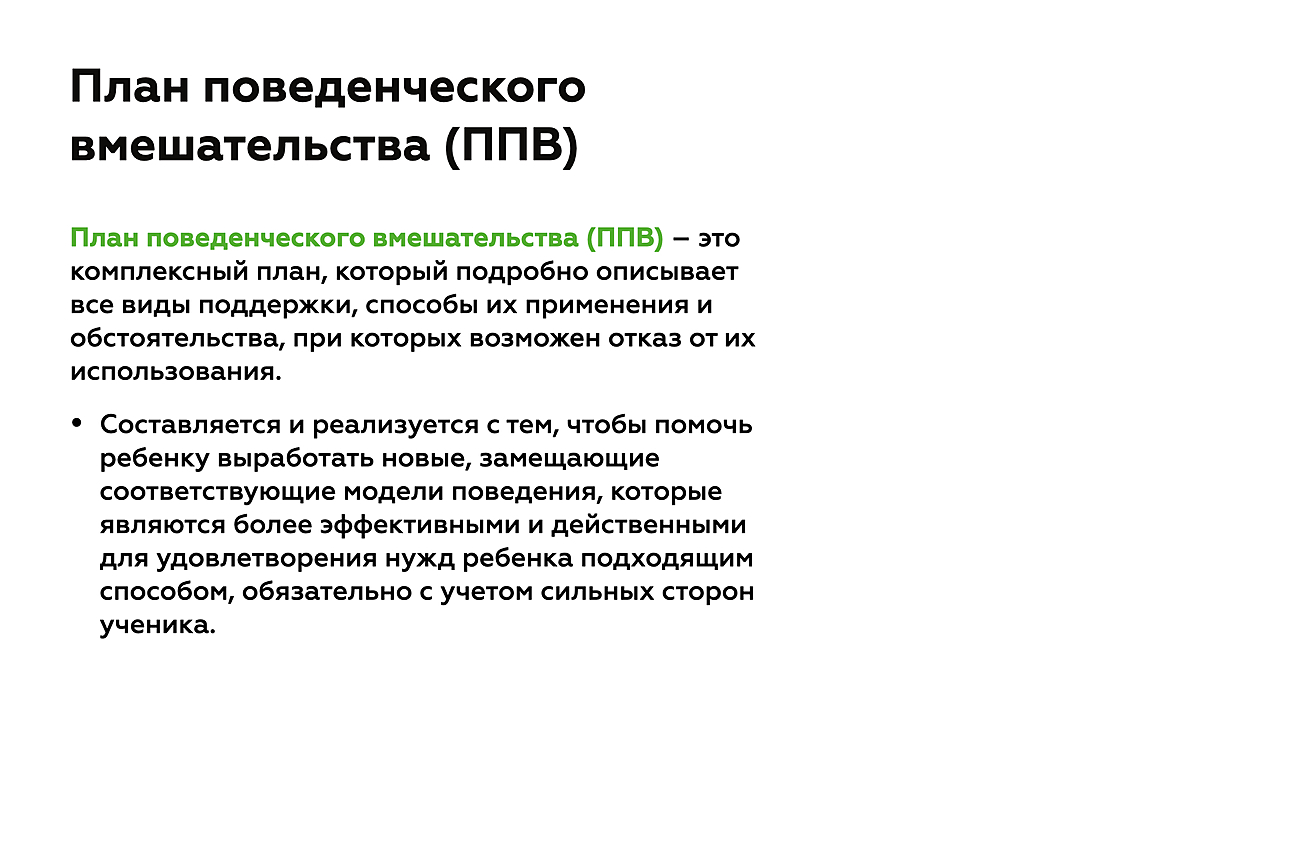 План поведенческого вмешательства (ППВ) — комплексный план, который разрабатывается индивидуально для каждого ребенка. В нем подробно описываются все шаги и меры, реализуемые с целью изменить/скорректировать нежелательное поведение. В плане вмешательства также подробно описываются способы оказания помощи и учитываются обстоятельства, при которых от нее можно отказаться.