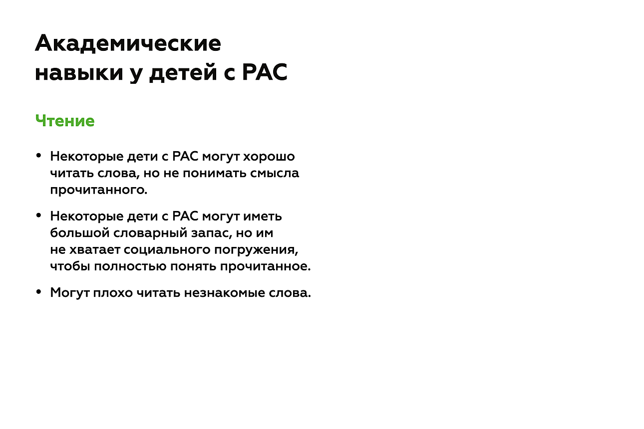 Самая частая проблема заключается в том, что ученик с РАС, уже успешно освоивший технику чтения и умеющий читать вслух, не понимает смысла прочитанного. Этот дефицит напрямую связан с уровнем владения языком, пониманием обращенной речи и наличием в пассивном и активном словарном запасе ребенка не только простых существительных, глаголов и предлогов, но и наречий, междометий; пониманием сравнительных характеристик; с уровнем способности к обобщению (навыков социального понимания).