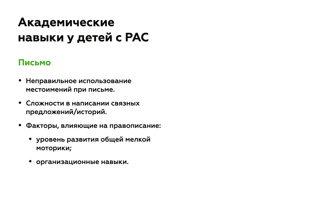 Учащиеся с РАС, которые обучаются по одному виду программы, тем не менее почти всегда демонстрируют разный уровень сформированности навыков. Факторы, оказывающие негативное влияние на формирование академических навыков, могут быть самыми разными. Например, проблемы с мелкой моторикой, которые не позволяют ребенку правильно писать буквы. Или, скажем, недостаточно высокий уровень сформированности организационных способностей, что напрямую связано с нарушением исполнительных функций4.