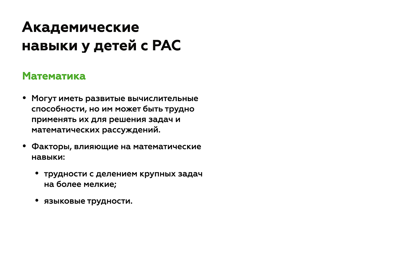 Учащиеся с РАС могут иметь развитые вычислительные способности, но им бывает трудно применять их для решения задач и для математических рассуждений. Опять-таки это может быть связано с языковыми трудностями или проблемами с исполнительным функционированием, а также неспособностью делить масштабные задачи на более мелкие этапы/процессы.