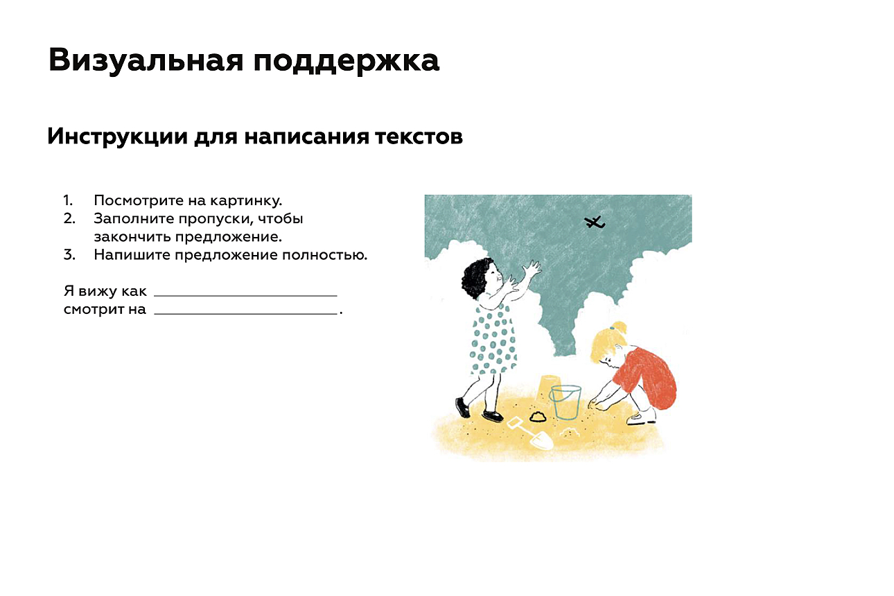 Оля читает, ей сложно понимать смысл прочитанного предложения. Поэтому Оле предлагают небольшие тексты из 4–6 предложений. Задание выглядит так: прочитать одно предложение и соотнести его с картинкой (представлен ряд иллюстраций к короткому тексту). Затем прочитать следующее предложение и опять соотнести его с картинкой.