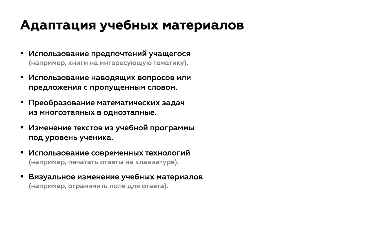 Адаптация материала подразумевает изменение способа его подачи (изменение шрифта текста, выделение цветом опорных слов в задаче, добавление рисунка или схемы к задаче и т. п.), при том что ученик осваивает программу наравне со сверстниками. Адаптация может заключаться в изменении (уменьшении) количества заданий, предъявляемых на одной странице тетради или листе, если ученик проявляет беспокойство при виде большого объема заданий. Эти задания могут предъявляться не все сразу, а постепенно, но уровень сложности останется таким же, как у одноклассников.