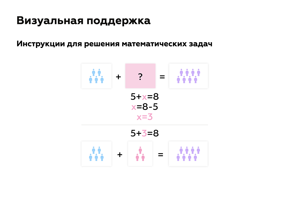 Может потребоваться дополнительная визуальная поддержка для решения математических задач в два действия. Учитель или тьютор может показать в дополнительной схеме или дополнительных вопросах этапность их решения.