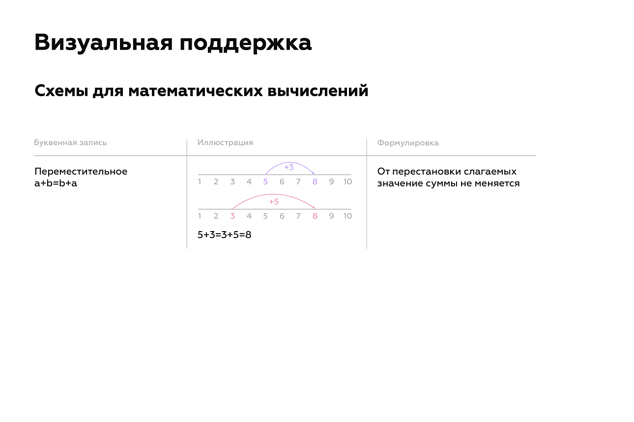 Нередко мы используем в обучении так называемые «помогайки» — небольшие папки, в которые вкладываем разные схемы, помогающие ученику выполнить ту или иную задачу. Это могут быть схемы решения примеров на сложение/вычитание, схемы решения задач в одно или несколько действий, образцы слов, обозначающих математические действия (+ или -), схемы решения примеров в столбик с переходом через десяток и т. п. Такие схемы чаще всего разрабатываются для конкретных учеников с учетом их индивидуальных навыков и возможностей. При этом учитель должен объяснить ученику, как правильно пользоваться схемами. Не следует полагаться на то, что ученик самостоятельно разберется, как выполнять задания, используя эти подсказки.