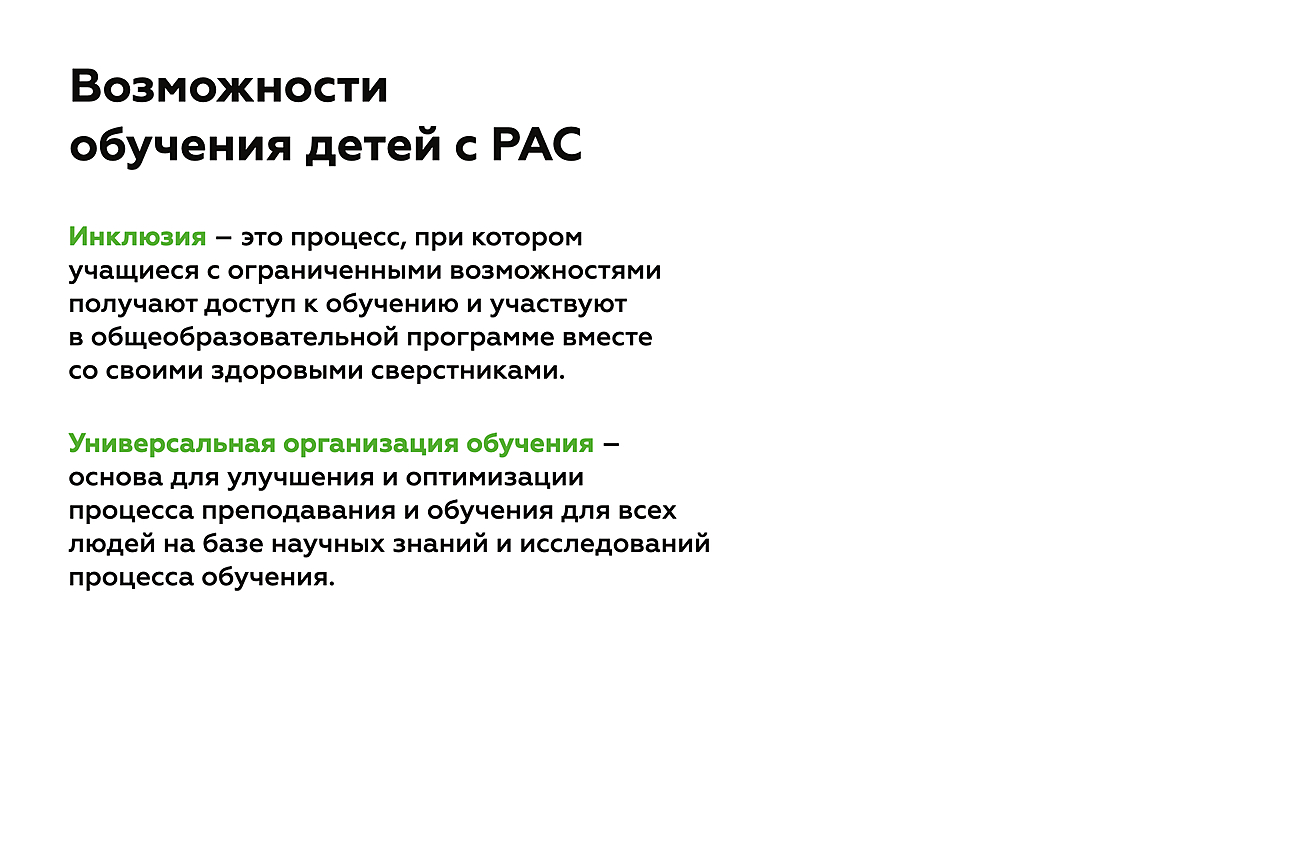 Создание универсальной модели обучения в условиях инклюзивного образования — довольно непростая задача с учетом того, что каждый ученик с РАС имеет свои особенности восприятия и специфику в демонстрации знаний. Чтобы максимально адаптировать обучение под нужды учащихся с особыми образовательным потребностями, мы должны организовать для них доступ к широкому спектру методов обучения.