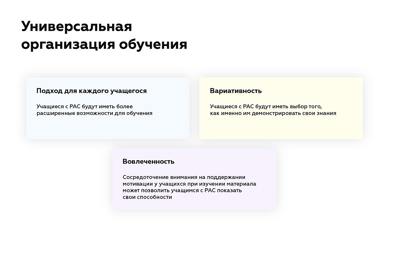 Универсальная организация обучения подразумевает под собой основу для улучшения и оптимизации процесса преподавания и обучения для всех на базе научных знаний и результатов исследования процесса обучения. На текущий момент, к сожалению, у педагогов школ недостаточно знаний в отношении работы с детьми с РАС. Нехватка знаний и понимания особенностей методологии преподавания зачастую приводит к тому, что учебный процесс выстраивается лишь на энтузиазме конкретных педагогов, без какой-либо систематизации. Например, учитель старается дать конкретные рекомендации и пояснения учащемуся с РАС при освоении нового материала, создать индивидуальную систему мотивации и индивидуализировать варианты учебного материала. Это прекрасно, когда такая возможность есть, и у педагога есть на это ресурсы. Ведь такой подход необходим для многих учеников, и было бы здорово, чтобы в случае необходимости индивидуализации методов обучения эти задачи выполнял помощник учителя или тьютор.
