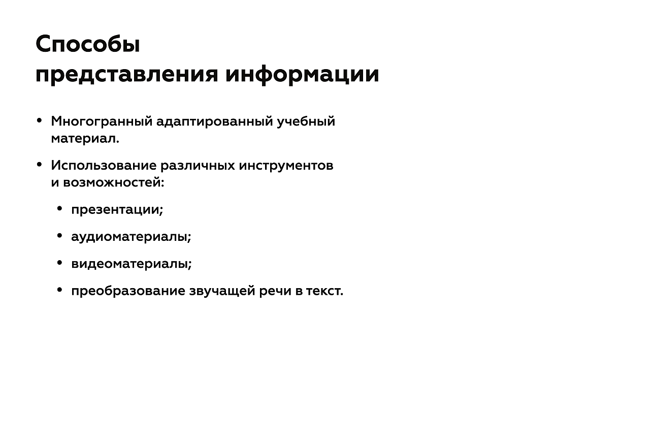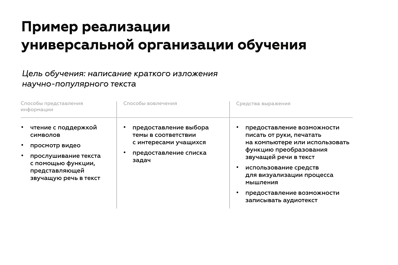 Давайте разберем компоненты универсальной организации обучения и обозначим, какой вклад они вносят в инклюзивное школьное образование. Для начала поговорим об адаптации учебных материалов на примере восприятия и осмысления информации, языка и символов.