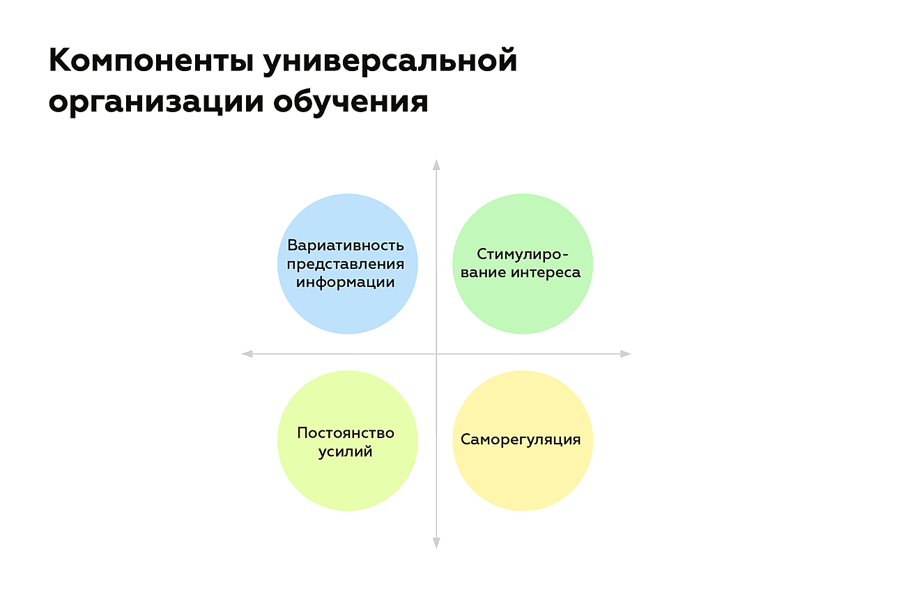 Для отечественной педагогической науки и практики понятие универсальной организации обучения является инновационным и редко употребляемым, в отличие от зарубежного опыта, где универсальный дизайн обучения давно применяется. Вместе с тем такие компоненты универсального дизайна, как адаптация образовательной программы под потребности конкретного обучающегося, создание благоприятной психоэмоциональный атмосферы в инклюзивной группе с развитием ряда инклюзивных ценностей, информационная открытость образовательной организации, также находят отражение в российской педагогике одновременно и в рамках нормативно правовых основ (Закон «Об образовании в РФ», ФГОСы и другие нормативно-правовые акты), и в концептуальных педагогических позициях. Все это свидетельствует о фактическом присутствии в содержательном отношении всех зарубежных компонентов универсального дизайна и в России.