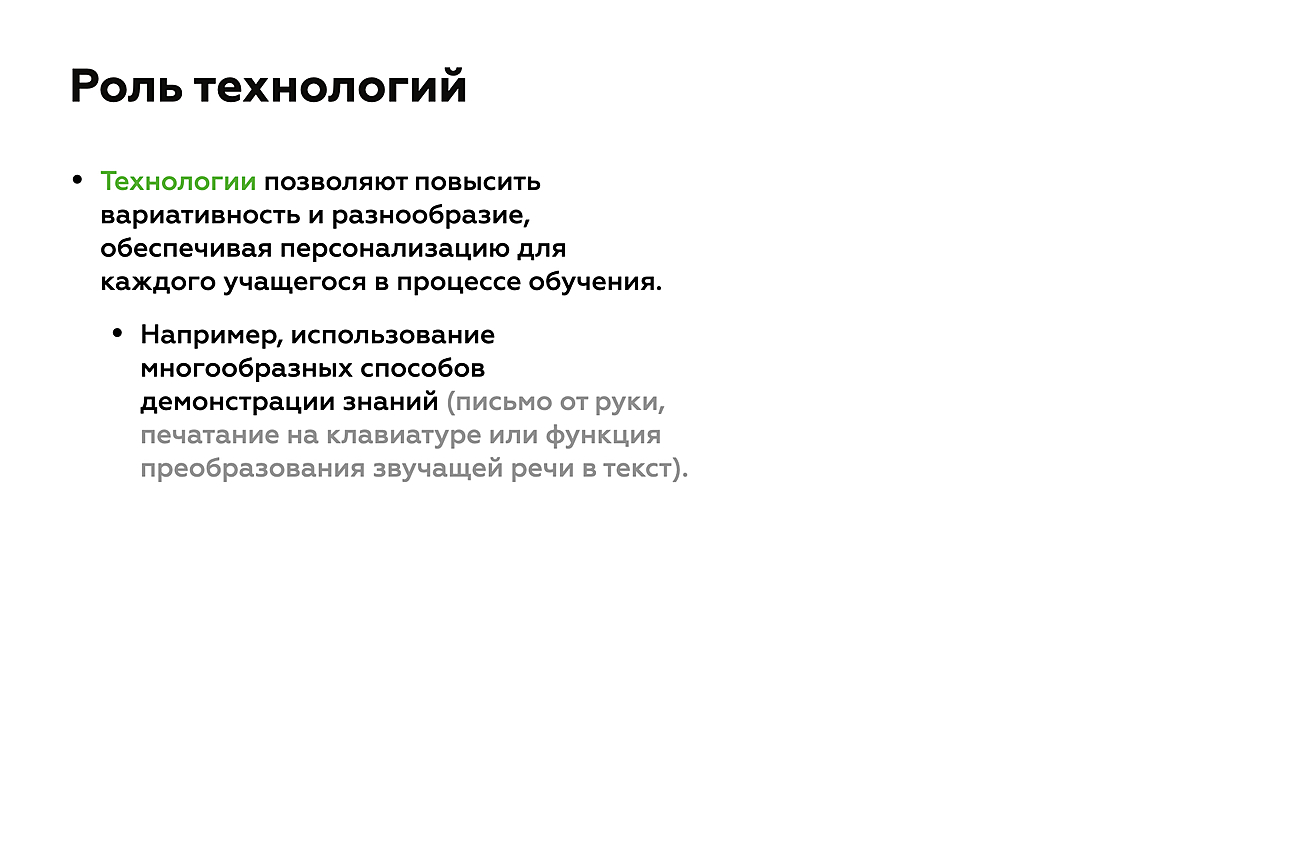 Для учителя во время фронтального занятия важно иметь возможность предоставить учебный материал таким образом, чтобы он был, с одной стороны, максимально информативен в соответствии с темой урока, а с другой стороны, давал бы возможность всем ученикам принять активное участие в обучении. Именно при использовании универсальной организации обучения выбор предоставляется всем ученикам. Различные технологии предоставляют высокую вариативность и разнообразие для обеспечения индивидуального подхода к каждому учащемуся в процессе обучения. Следовательно, такая система хороша для всех, а некоторым просто необходима, особенно ученикам с аутизмом.