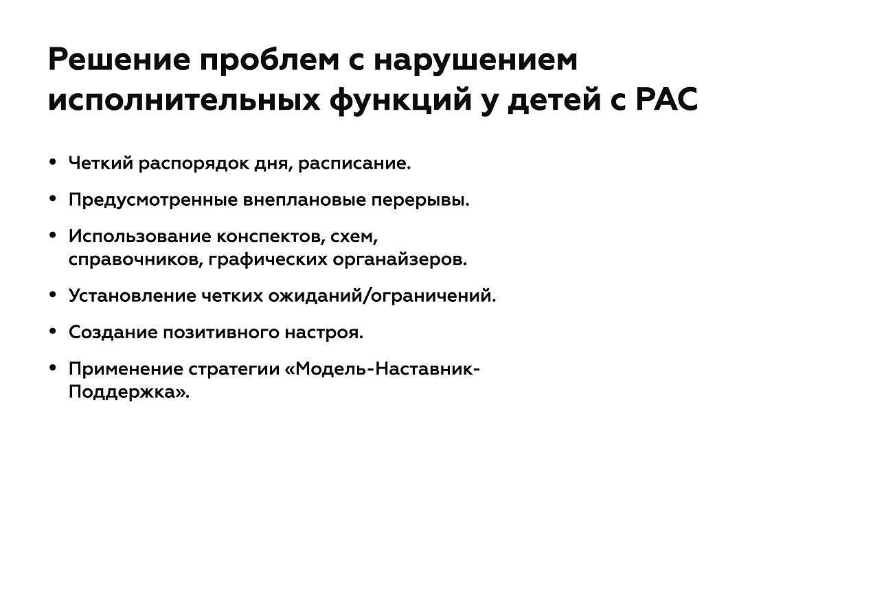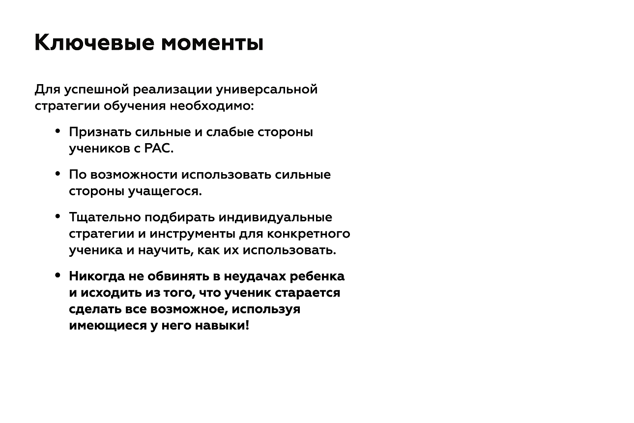 Важно помнить, что у каждого человека есть свои сильные и слабые стороны, будь то люди с расстройствами аутистического спектра или нейротипичные люди. Поэтому мы должны спросить себя: «Как можно решить ту или иную проблему, опираясь на сильные стороны ученика для того, чтобы компенсировать слабые?»