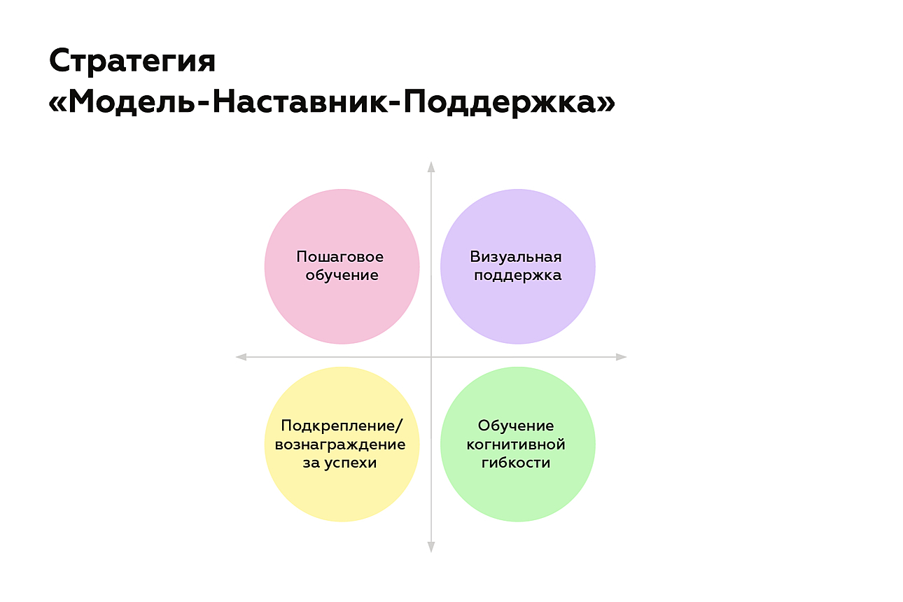 Следующая стратегия — «модель, наставник и поддержка» — важна не только для людей с расстройствами аутистического спектра, но и для большинства из нас, ведь для любого обучения более эффективно, когда информация подается в различных формах. Представьте, как человек может научиться ездить на велосипеде. Можно рассказать, как это сделать; еще удобнее и нагляднее — показать; а самый лучший вариант — дать человеку попробовать сделать что-то самому, а потом похвалить!