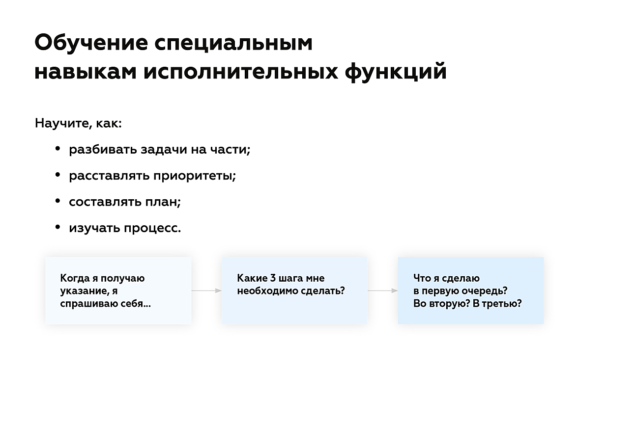 У Кости (11 лет) есть план на многие режимные моменты: мытье рук, одевание на улицу, а также есть алгоритмы для решения задач и выполнения домашних заданий. Пока Костю не обучили самостоятельному выполнению пунктов этого плана, слова мамы «одевайся» или «сейчас будем обедать» не побуждали его к выполнению, поскольку он не понимал, с чего начать действие. Тогда мы стали обучать Костю именно процессу, и хотя сначала процесс представлял собой простое следование сценарию, мы использовали его, чтобы научить ребенка навыкам организации, планирования и расстановки приоритетов.