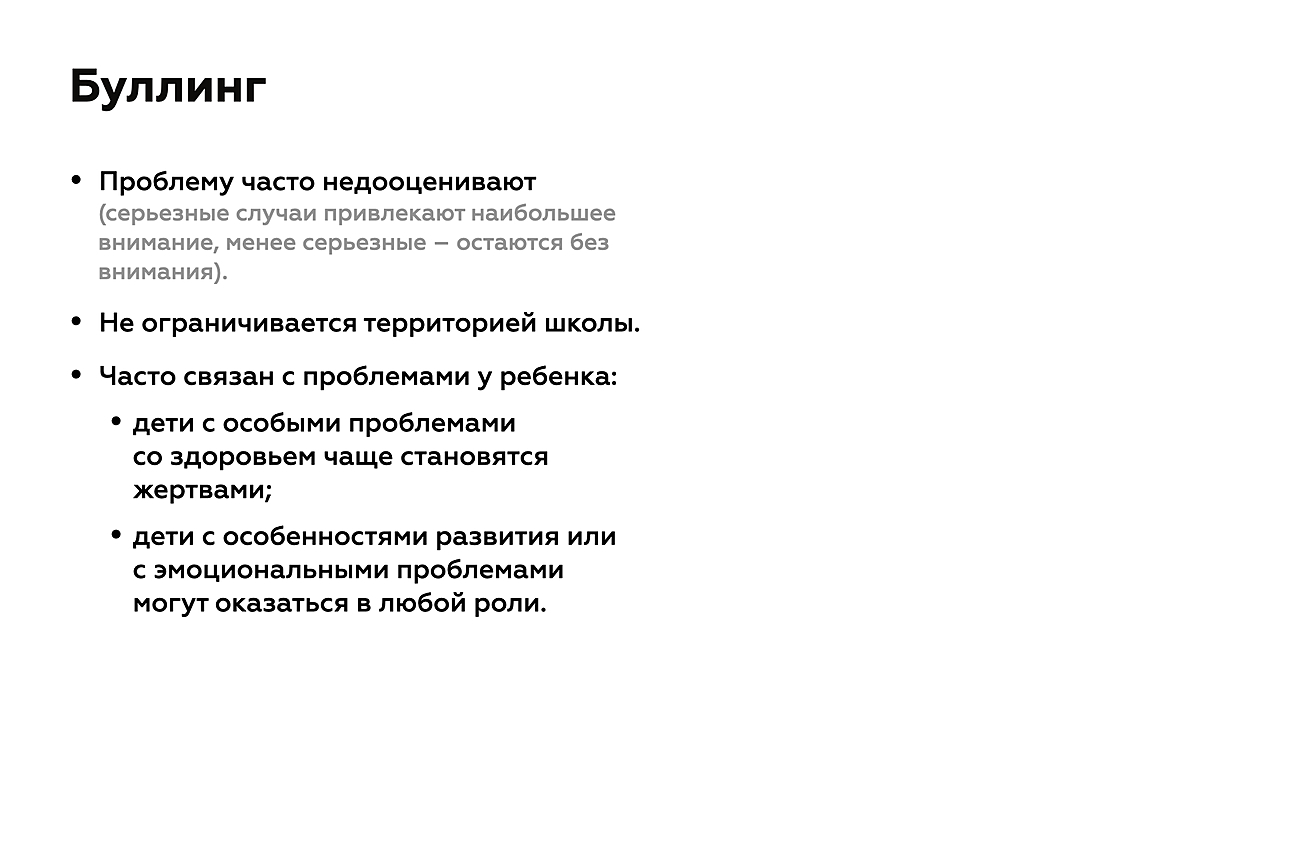 Проблему буллинга часто недооценивают, реагируя только на серьезные проявления травли, тогда как менее серьезные издевательства остаются без должного внимания. Обычно буллинг возникает на фоне нарушения равновесия сил (в социальном или физическом плане) и включает в себя разнообразный набор моделей поведения1. Издевательства одного школьника над другим могут быть связаны с демонстрацией физического или социального превосходства. Например, чем ниже достаток семьи ребенка, тем выше его риск подвергнуться буллингу. Такая травля происходит не только на территории школы, являющейся типичным местом для подобного явления, но и на детских площадках, в школьных автобусах, на улице и т. д.